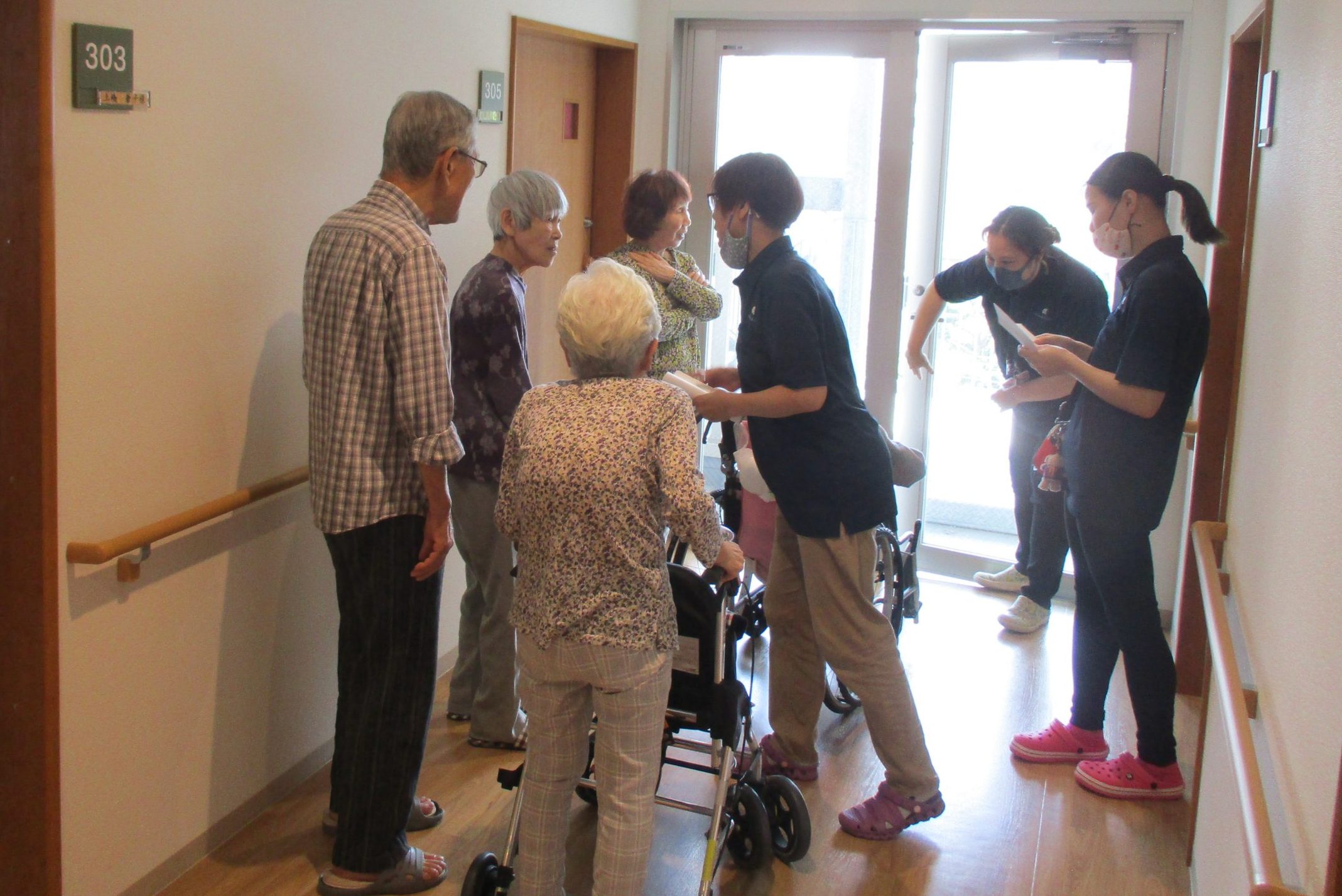 私こだまと管理者が指導役で、今回はシナリオを作らずご入居者もスタッフの指示のもと避難をしていただきました。