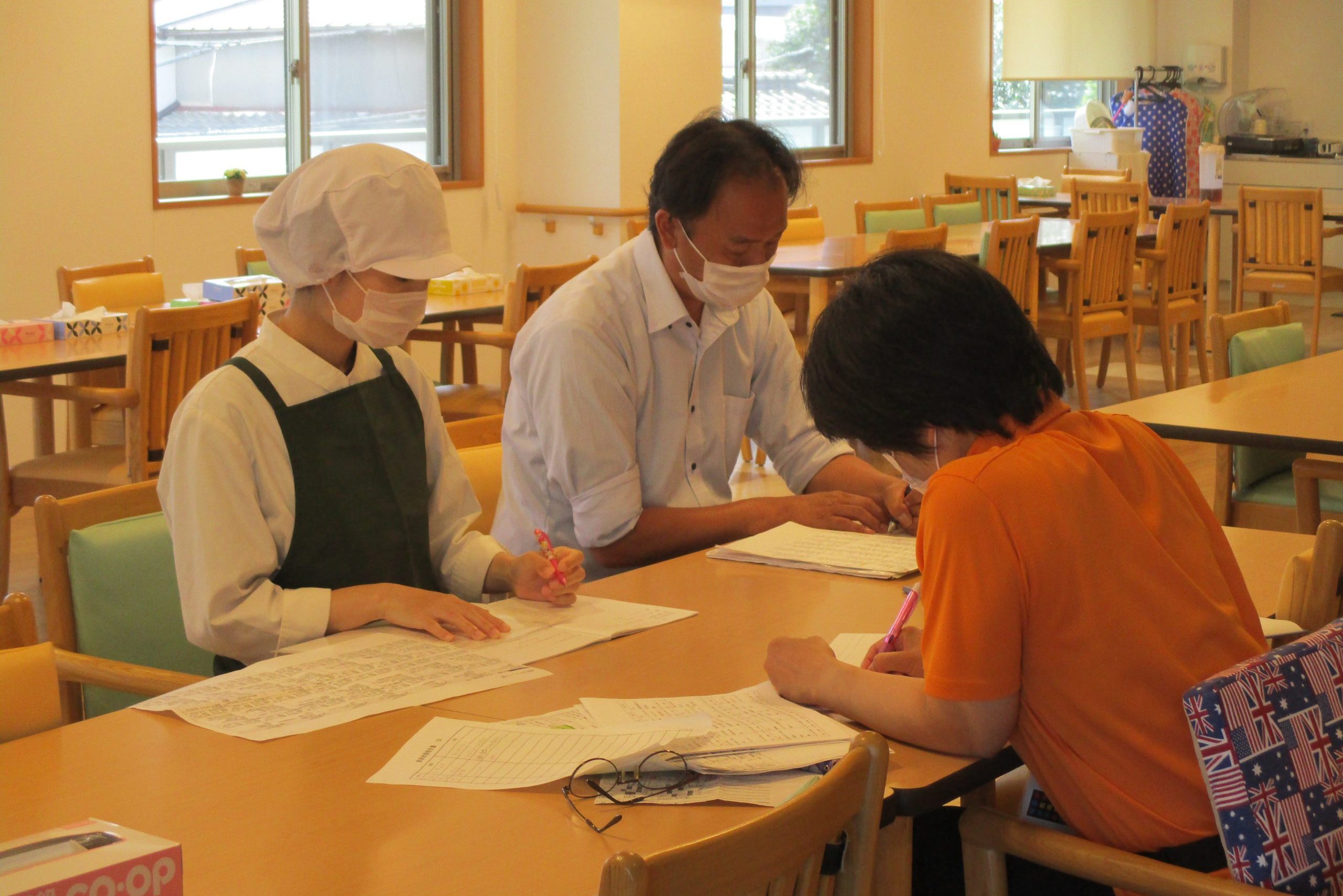 そして、ご入居者自身で美味しい食事を食べいただくことを目標に、訪問看護の言語体操担当者と摂食嚥下や口腔ケアについて学び実践しています。
