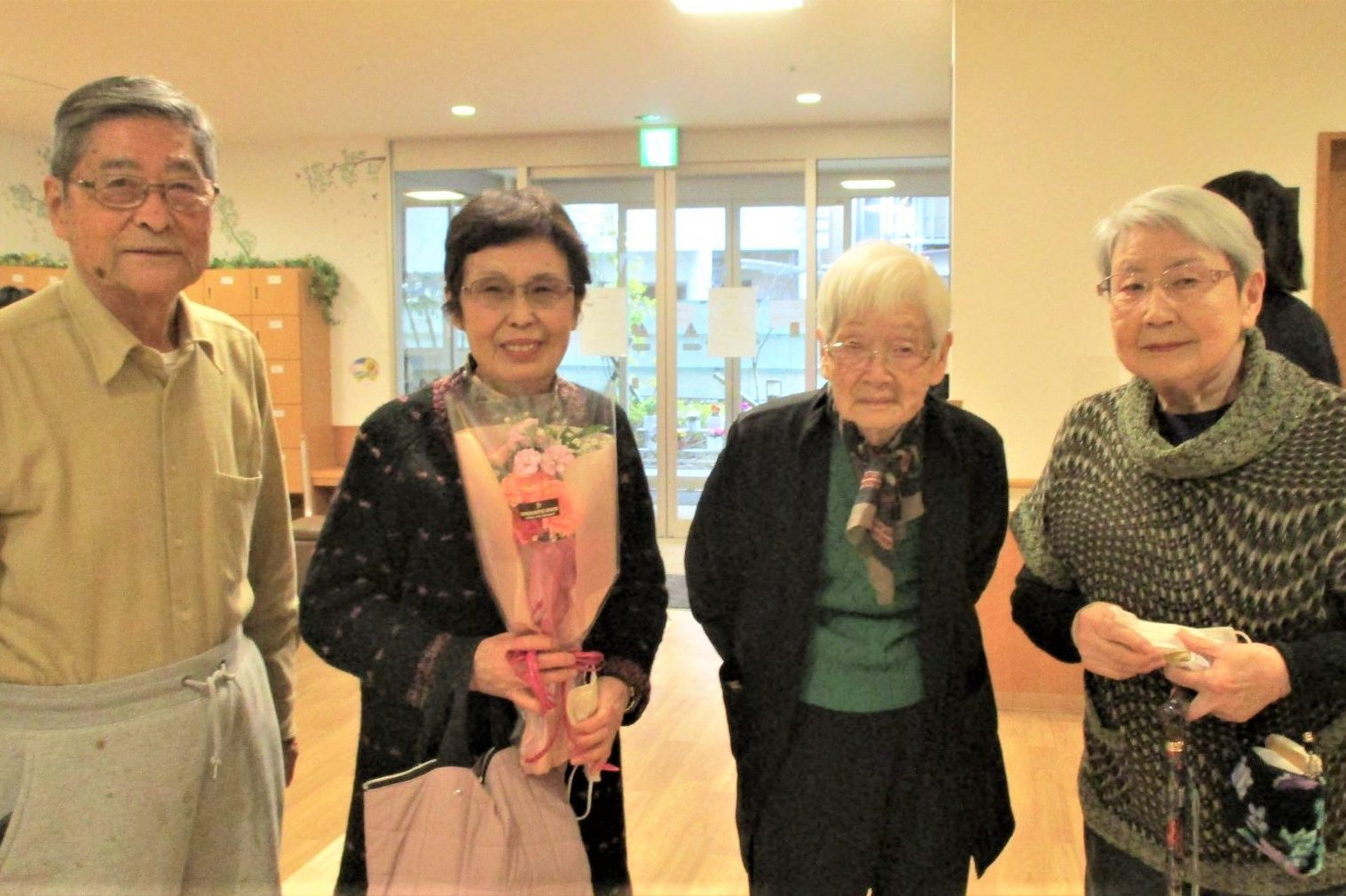 施設のお掃除をお願いすることはでませんが・・・毎日スクワットや足腰を鍛える運動を欠かさず、お散歩に出かけられとても活動的です。