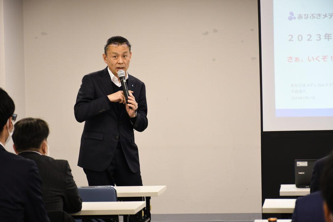 おおたに社長から、日本の現在の社会情勢や介護・福祉業界の状況、あなぶきグループ全体などのお話がありました。また、中期経営計画に基づいた重点戦略を振り返り、そのひとつである「働きがいの創出」という点で、下半期にベースアップを行う予定についてもふれられました。