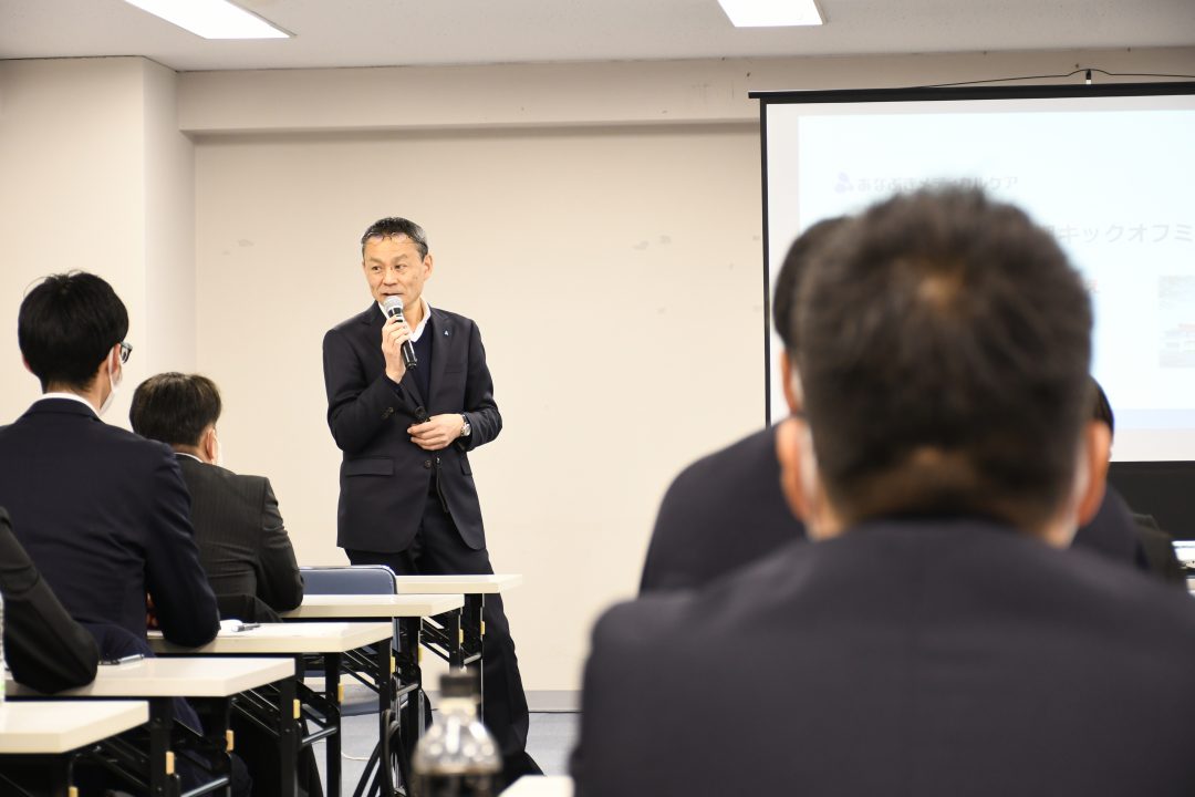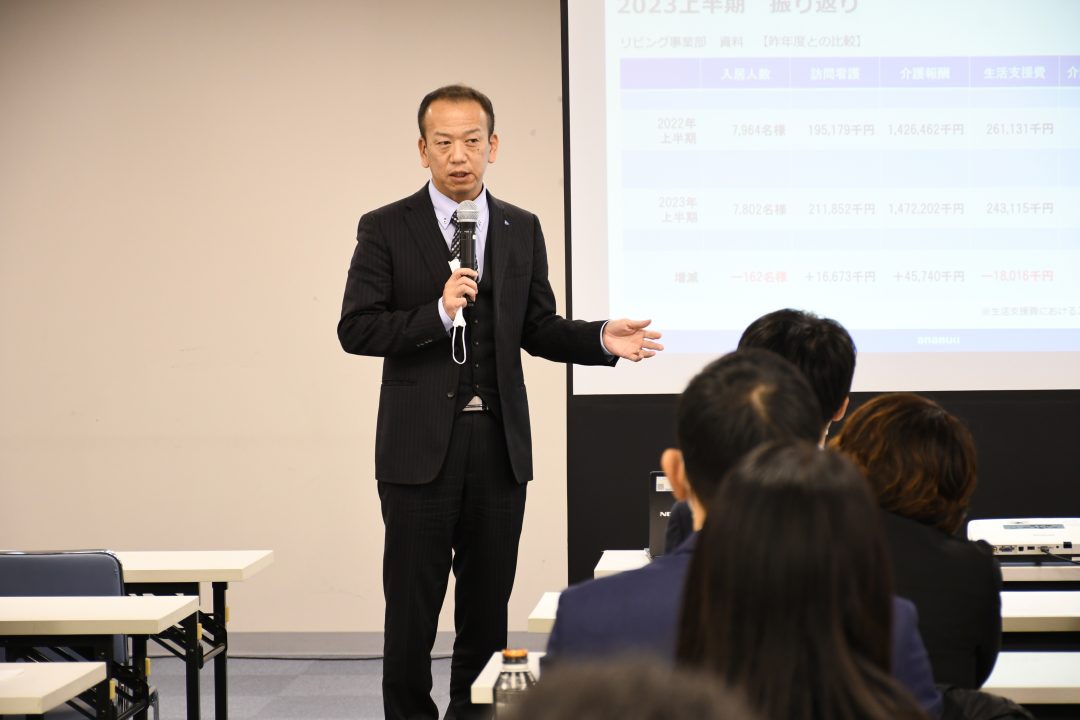 続いて、おぶ事業本部長、ひろた事業部長、しまづ管理部長、あなぶき興産シニア事業部もりすえ事業部長、あなぶきヘルスケア高齢者住宅紹介事業部ふくなが部長より、各部門の上半期振り返りや、方針の発表がありました。