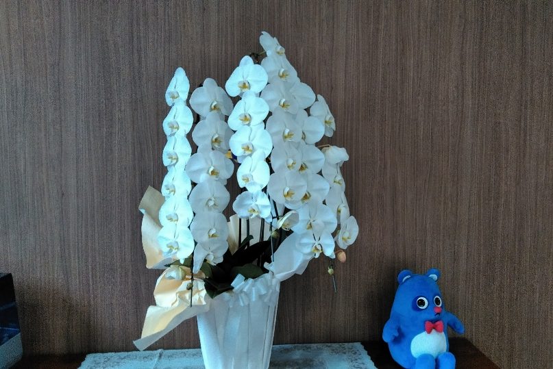 昨年、ご入居者のKさまより、「一人で見るより皆さんに見てもらいたいから」とのご厚意で、立派な胡蝶蘭を玄関に飾らせていただきました。