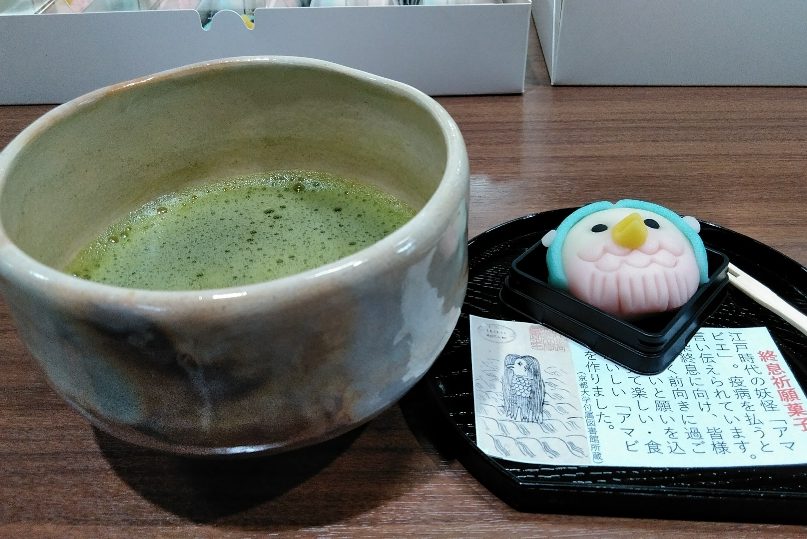 食後にお抹茶とねりきりの可愛いアマビエ和菓子をいただき、「コロナ退散~!!」と皆さんと願いました。