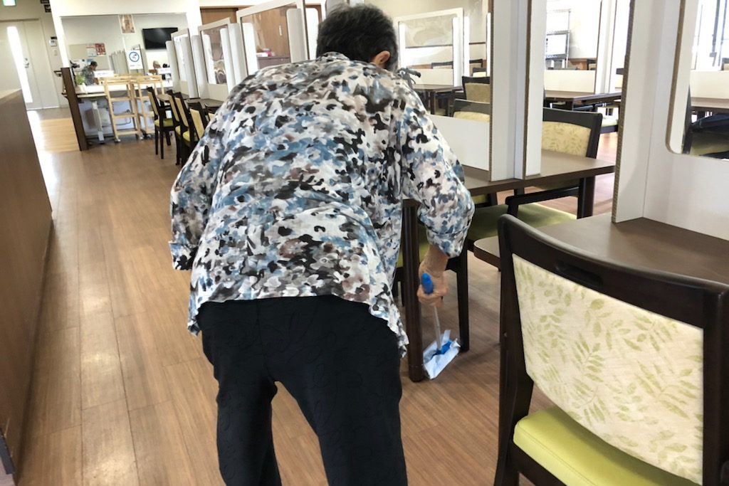 「そこ!ゴミが落ちとるから、避けとってよ、拭くから!」と、次にどの順番で掃除するかなど、手順をご自身で考えられ私たちスタッフもサポートをさせていただいています。