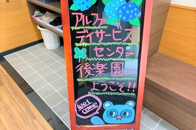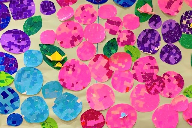 デイサービスの入り口のあるウエルカムボードも、一面の壁紙も、紫陽花をモチーフにし作成しました♪