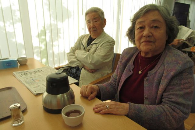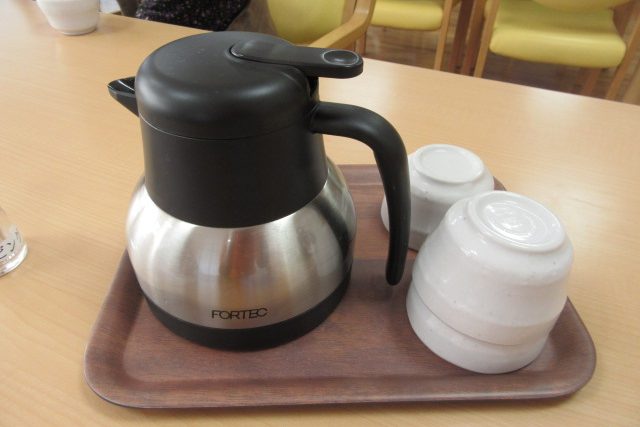 セルフサービス開始日、各テーブルにポットと湯飲みをセットしてご入居者の様子を見ていると、ご入居者自らお茶を入れたり、周りのご入居者同士で声をかけ合いお話も弾んでいました。