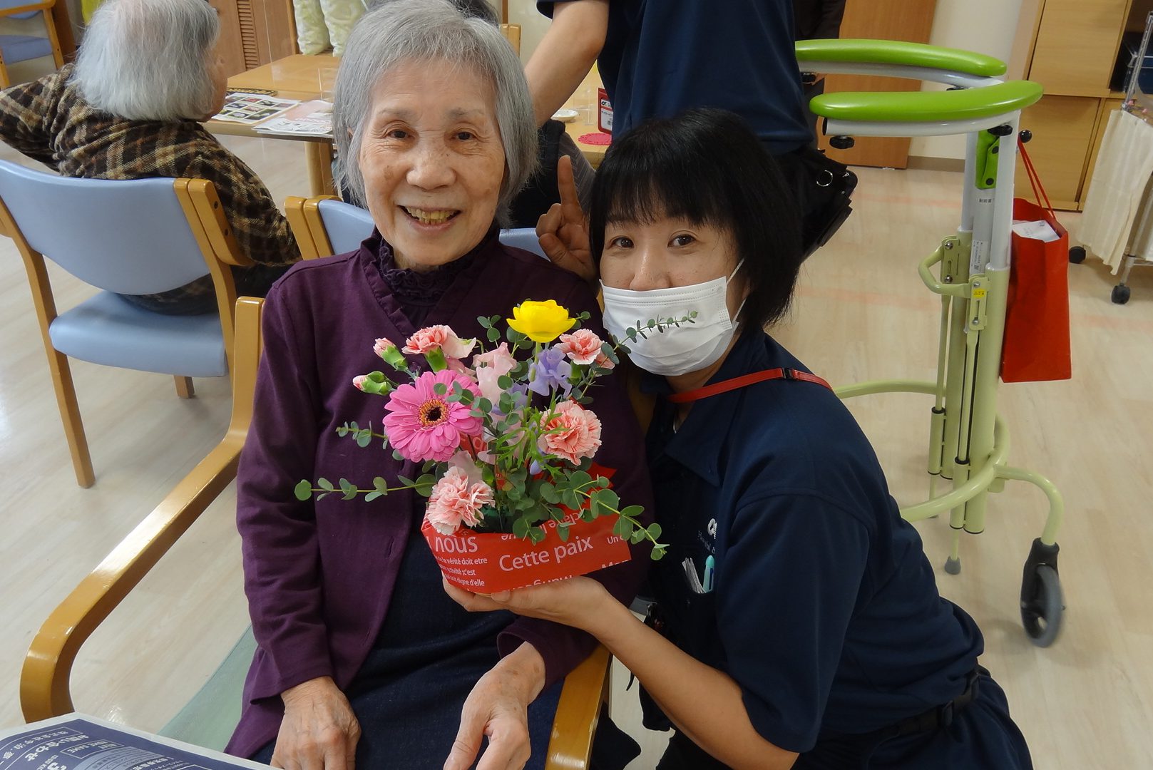 最初は「無理よぉ」と消極的でしたが、スタッフが声をかけ沢山のお花から1本、また1本と花を選び、香りを嗅いでみると昔を思い出したご様子。