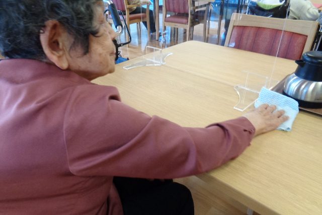 ご自身が使うテーブルを拭いていただき、普段は、毎食後スタッフが行っている消毒も一緒に行っていただきました。