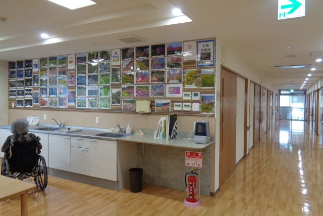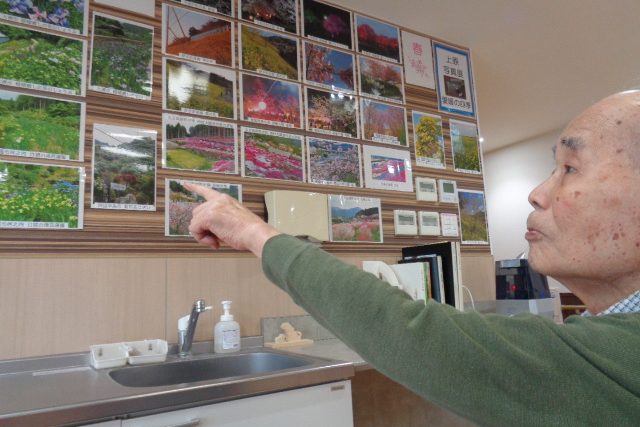 アルファリビング松山久万の台の3階フロアでは、ご入居者同士にコミュニケーションを深めていただくため、壁に色々な写真を貼ったり、手に取って見ていただけるよう写真ファイルをご用意したり工夫をしています。