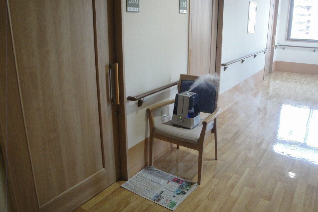 常に換気し空気を流し、いつでもどこでも手指消毒ができるように消毒液を配置し、空気清浄機や消毒の噴霧器も設置し注意喚起しています。