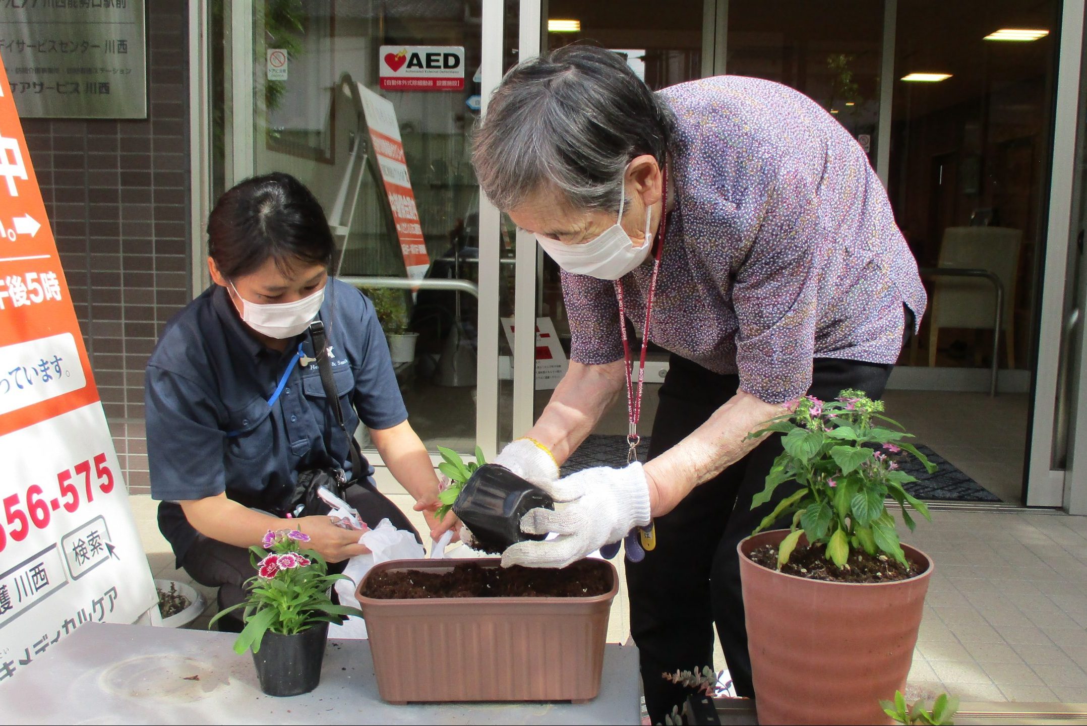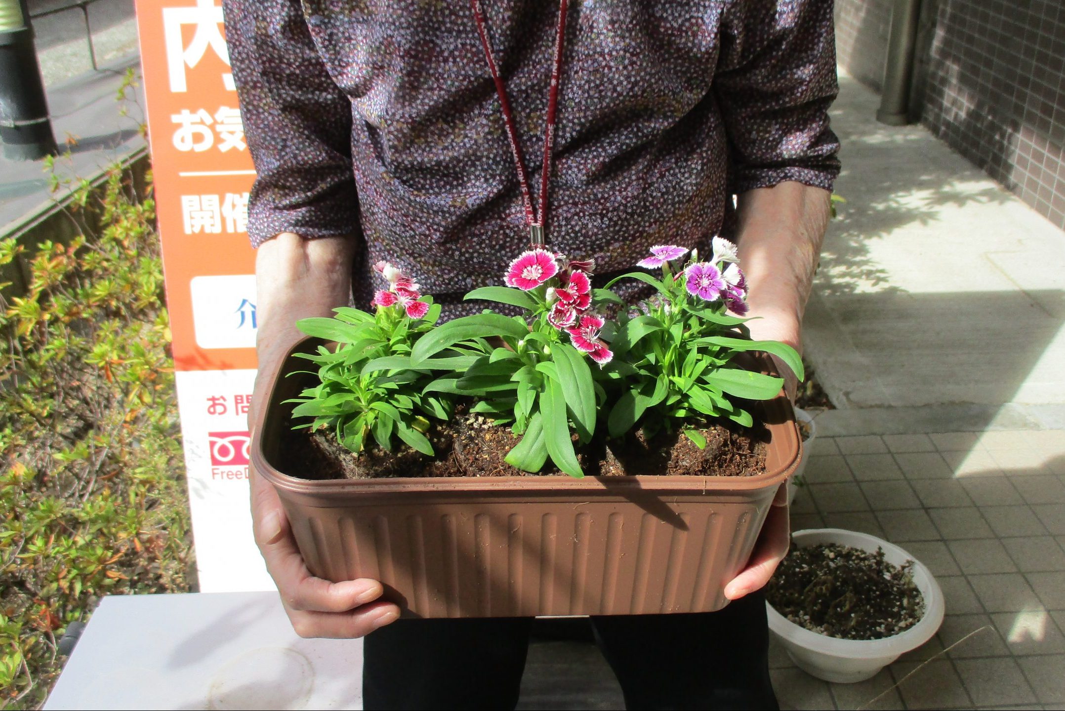 Yさま先日、ご家族が持ってこられたお花の苗を看護スタッフとともに手植えされました。