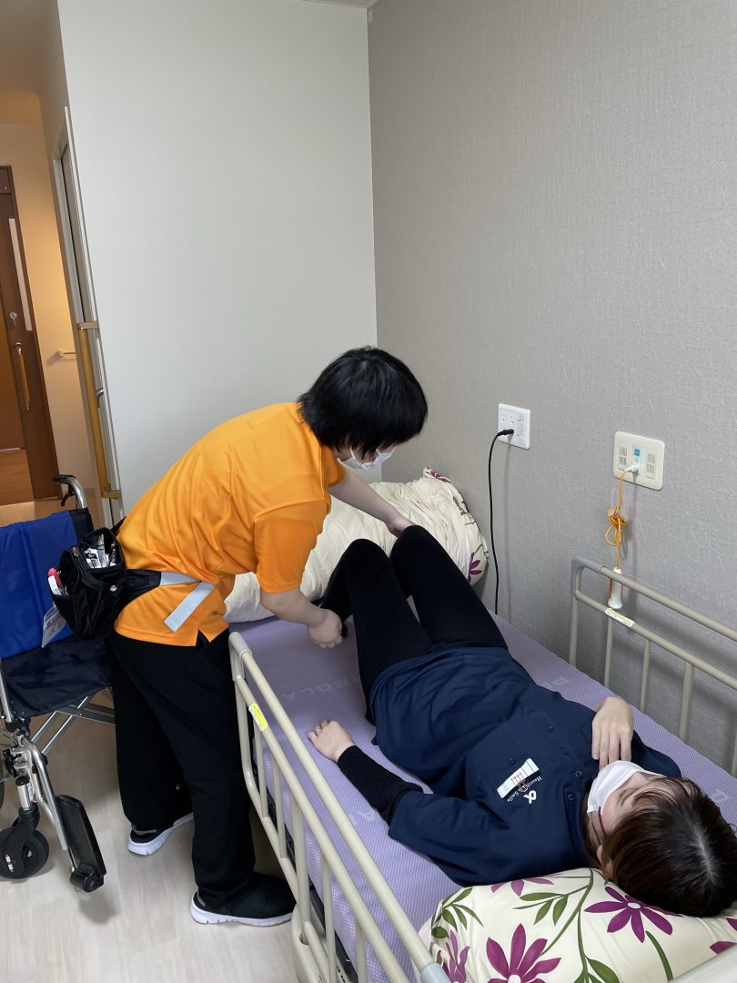 一人夜勤の時に、ご入居者が転倒した場合などには、入居者をベッドに移乗する必要があります。基本的な技術を身につけるため、復習もふまえて行いました。