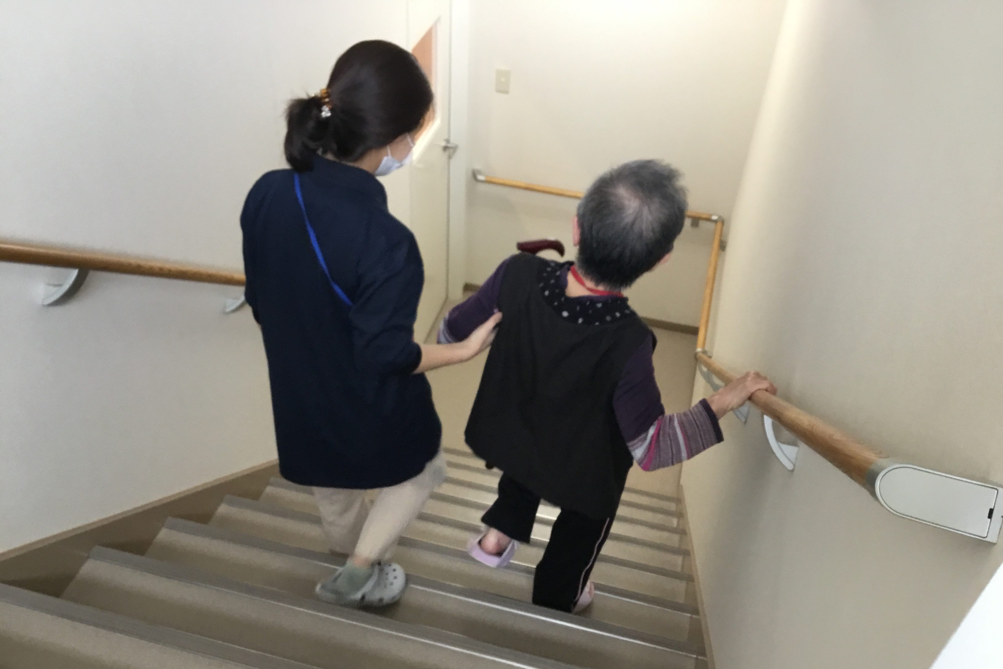 いざという時に備えて、階段を使っての避難も一歩ずつ、ご入居者も一緒に頑張りました。
