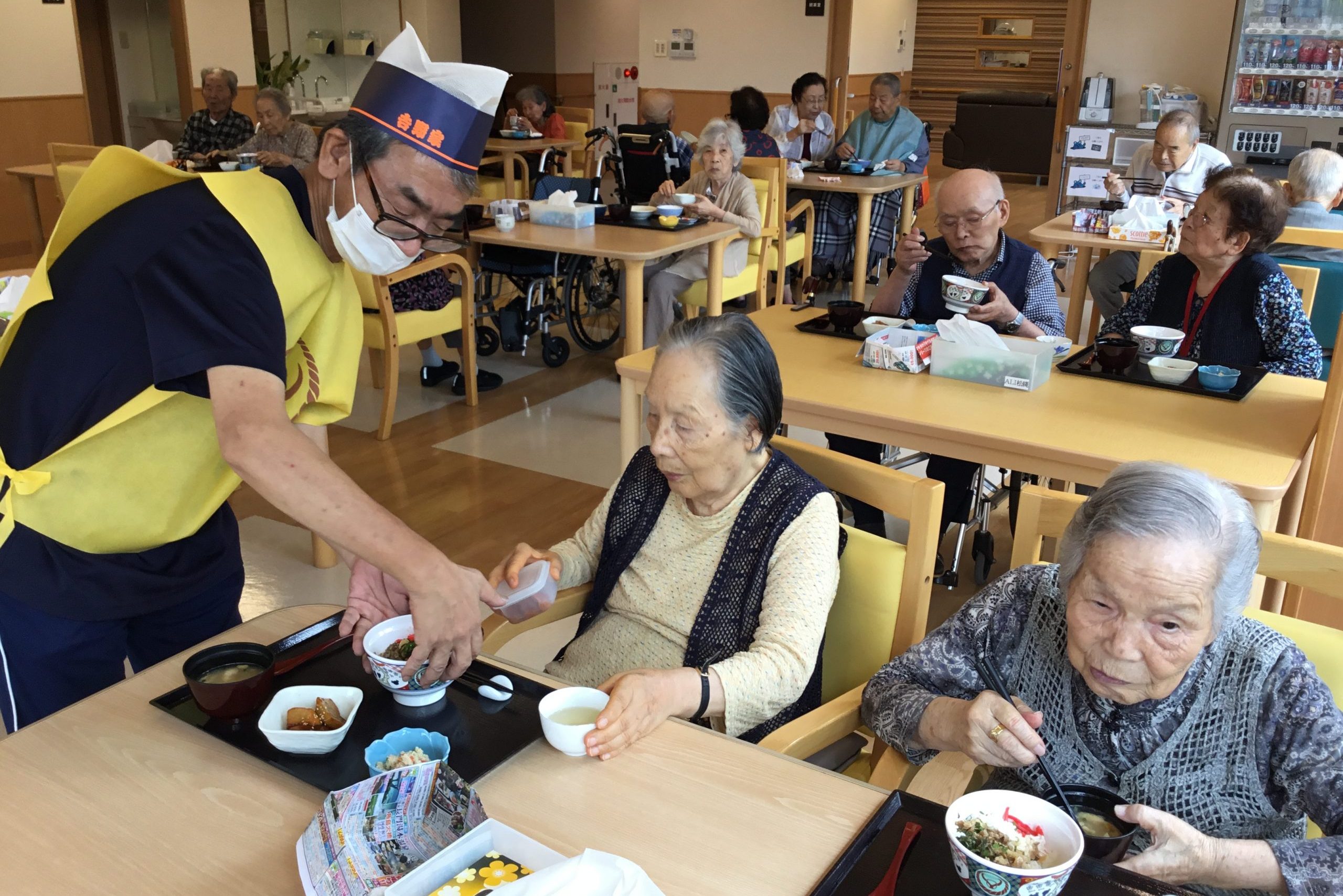 スタッフ全員で吉野家のハッピを着てお出迎えすると、ご入居者が驚かれ、本当に吉野家に行って食事をとっているかのようでとても喜ばれていました。