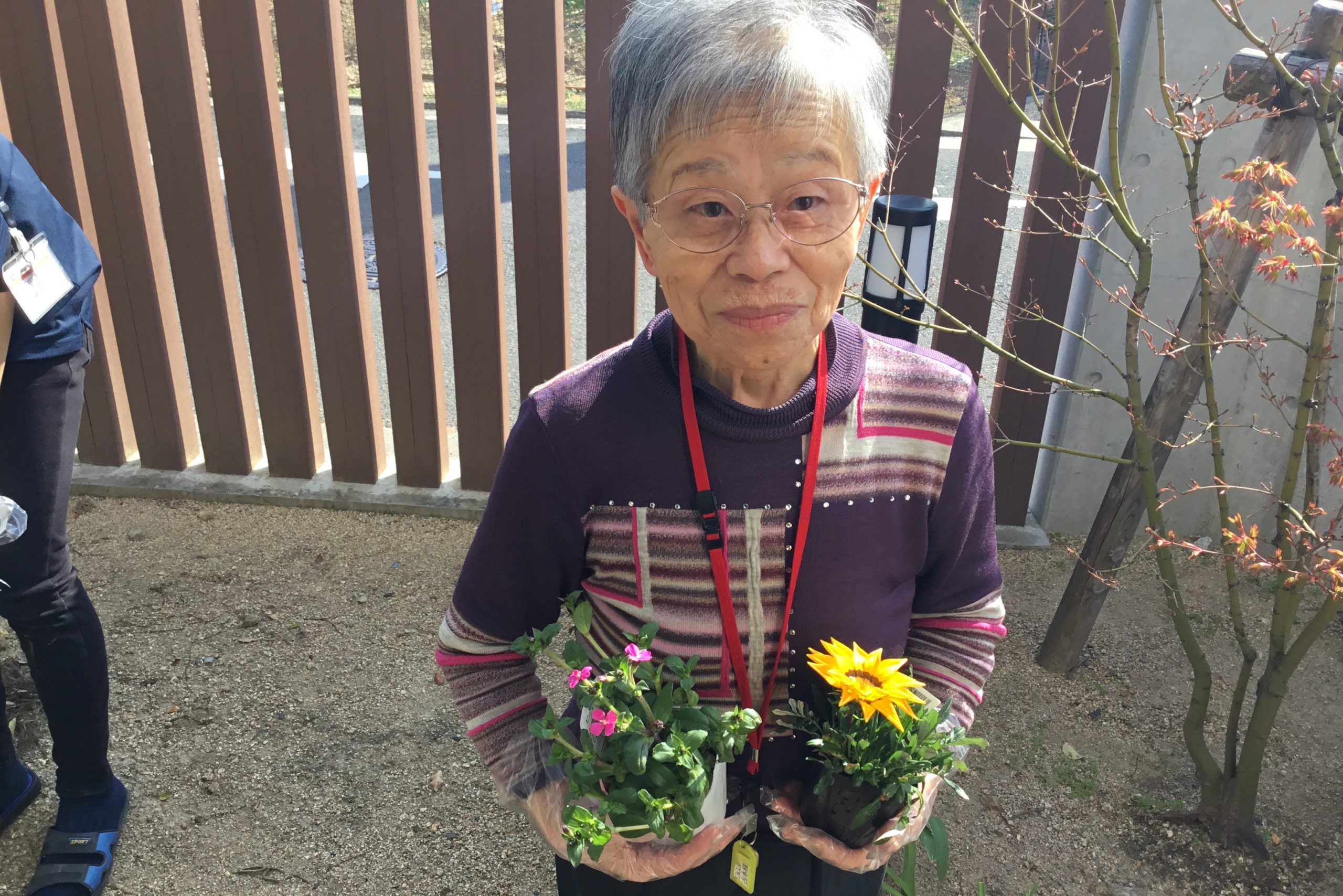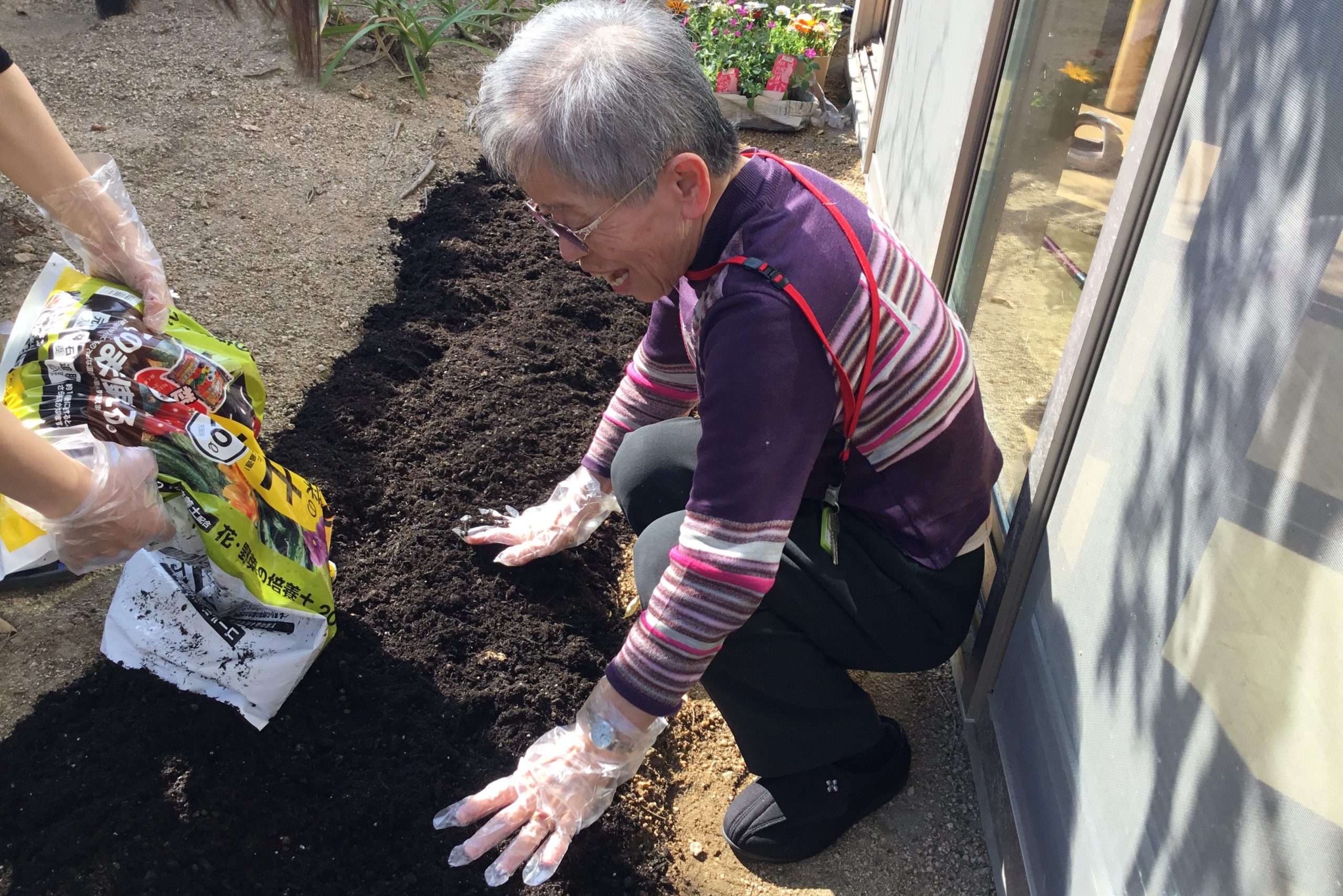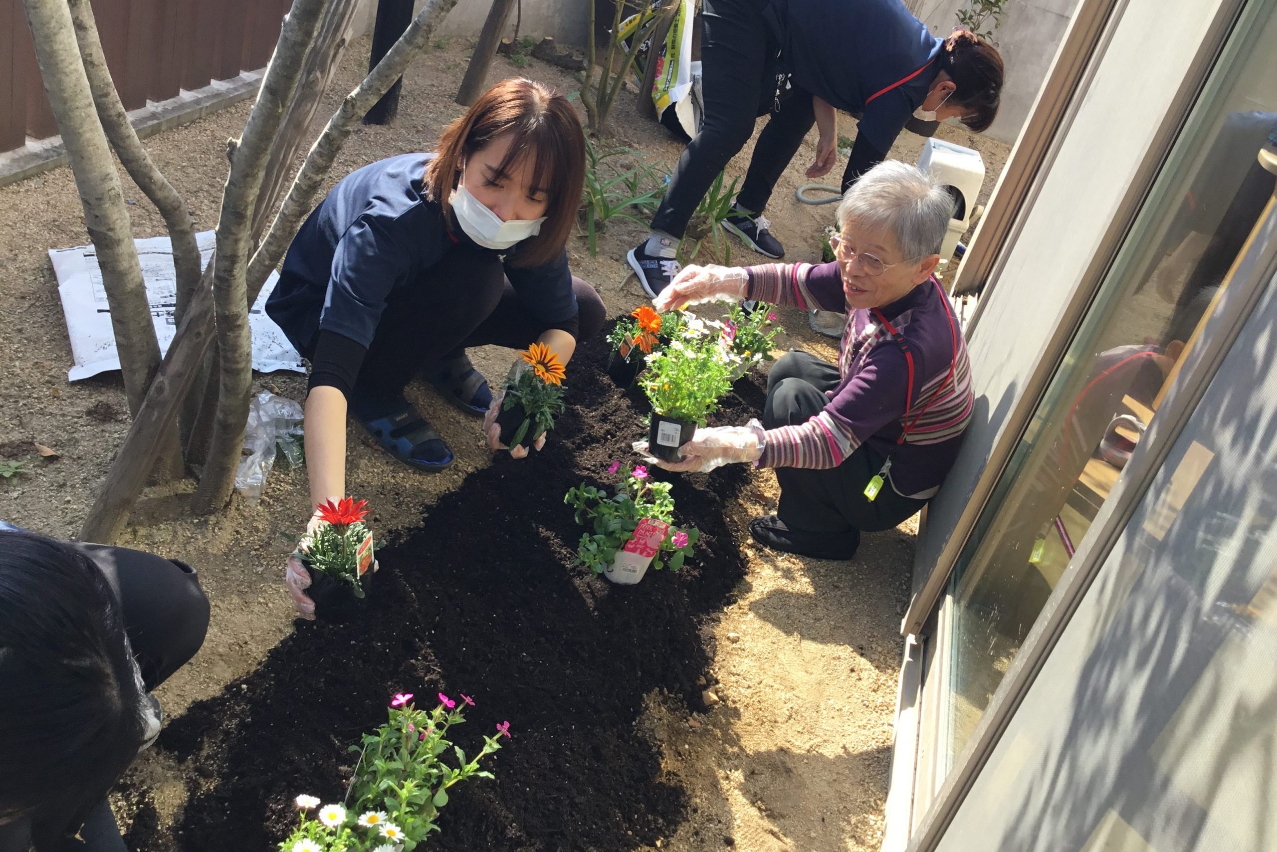ご入居されているFさまがお花の先生だったので、植え方を教えていただきながら一緒に行いました。