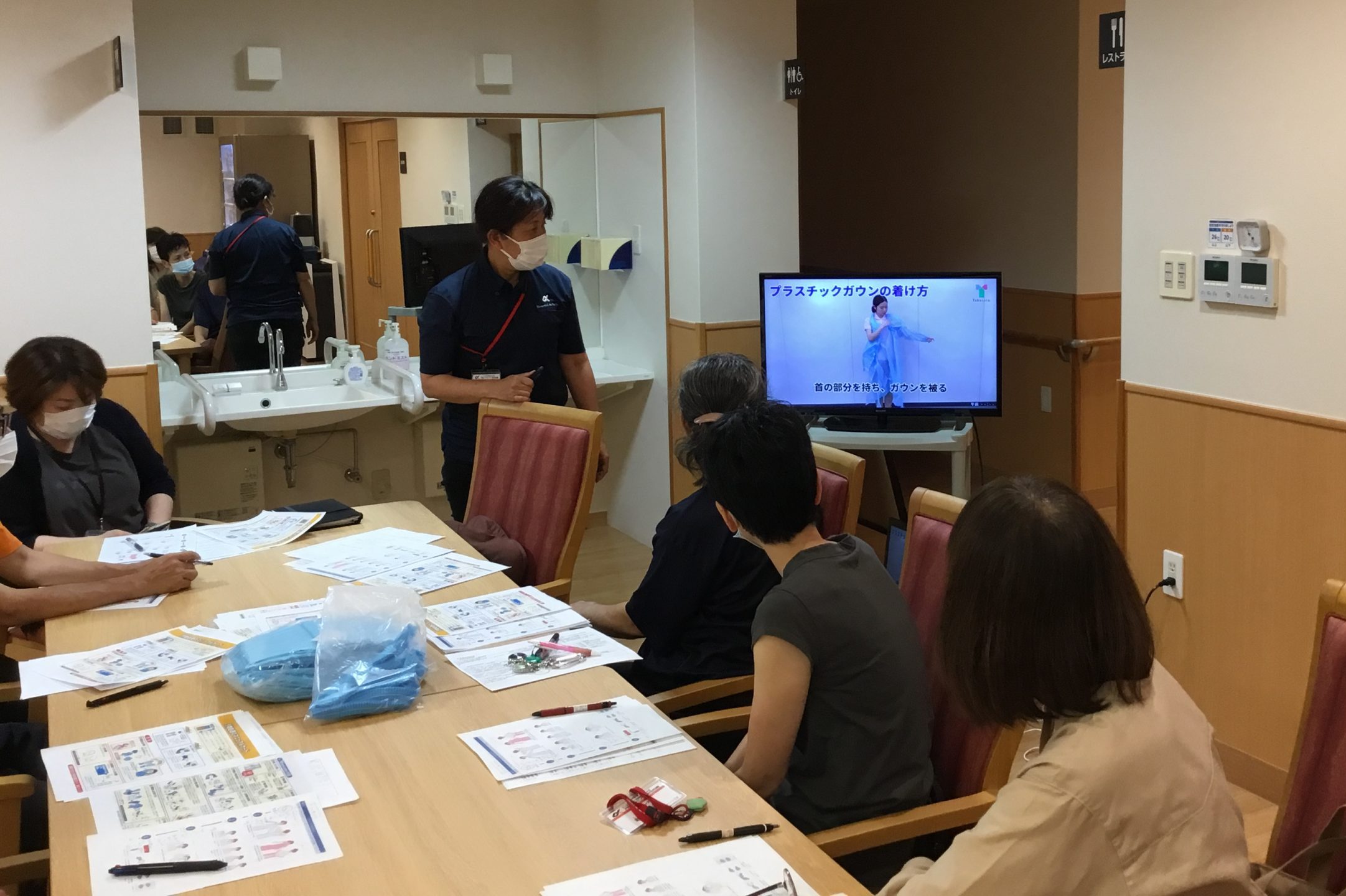 説明を受けながら一人一人防護服の着脱の練習をしながら、手順の再確認をしていきました。