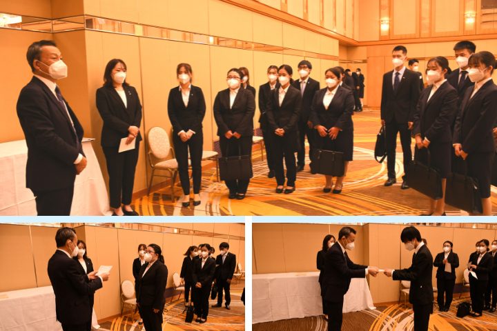 穴吹興産のあなぶき社長からお祝いの言葉をいただいたあと各社に分かれ、おおたに社長より各々に内定証書を授与しました。
