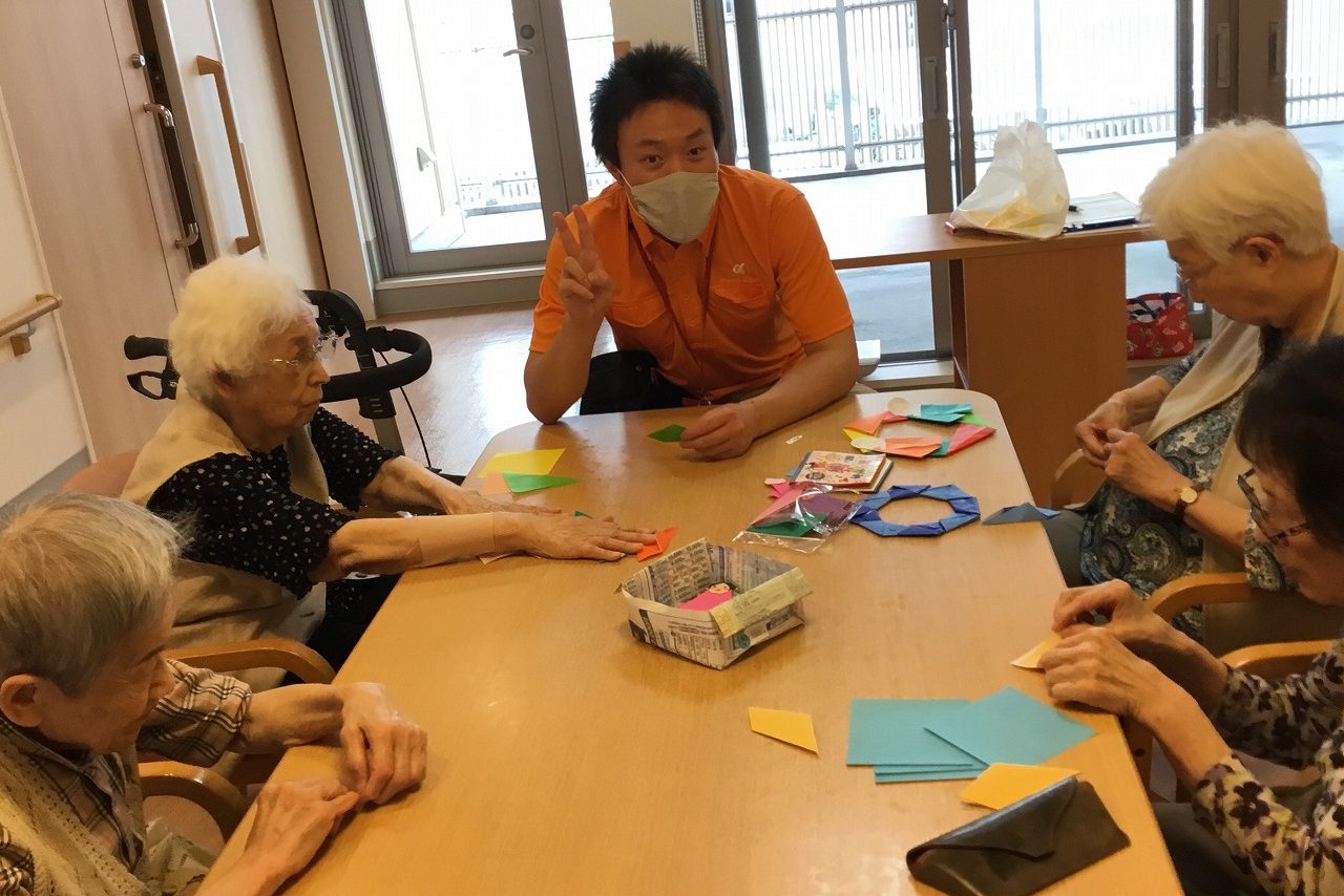 七夕も近く、スタッフの呼びかけに3階フロアのご入居者の皆さまが集まり、各居室の短冊飾りを作りました。