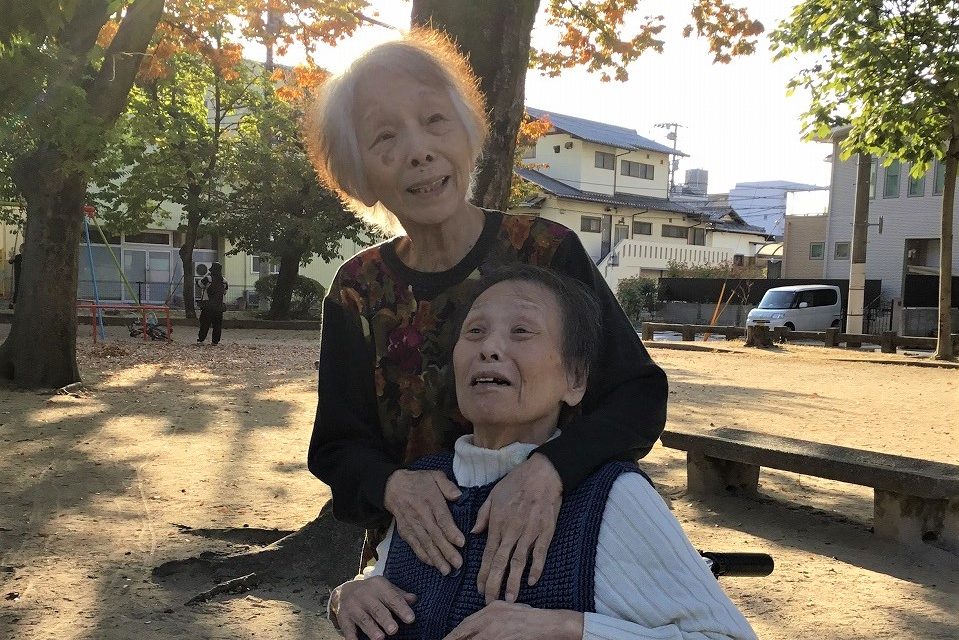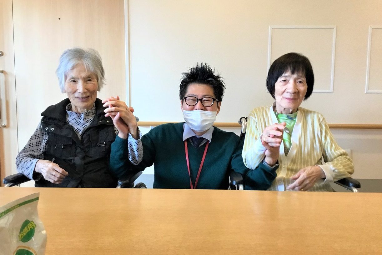 ご入居者のYさま(写真左)は、体も衰弱して寝たきりでしたが、ごはんも刻みから普通食にもなって食欲旺盛でいつもおかわり。今ではほとんどフロアで過ごせるほど元気になりました。