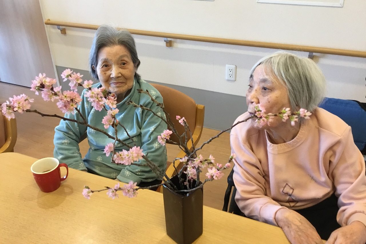 ご入居者のご家族が桜を持ってきてくださり、各階の共用部に飾り、ご入居者には少し早いお花見を楽しんでいただいています。