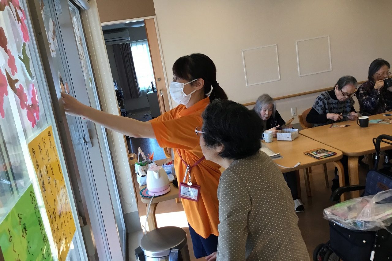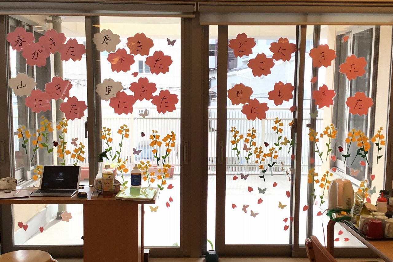 外出ができなくてもご入居者には移り変わる季節を少しでも感じ、ワクワクした気持ちになっていただけたらと、各階の共用部の窓を春らしく飾り付けました。