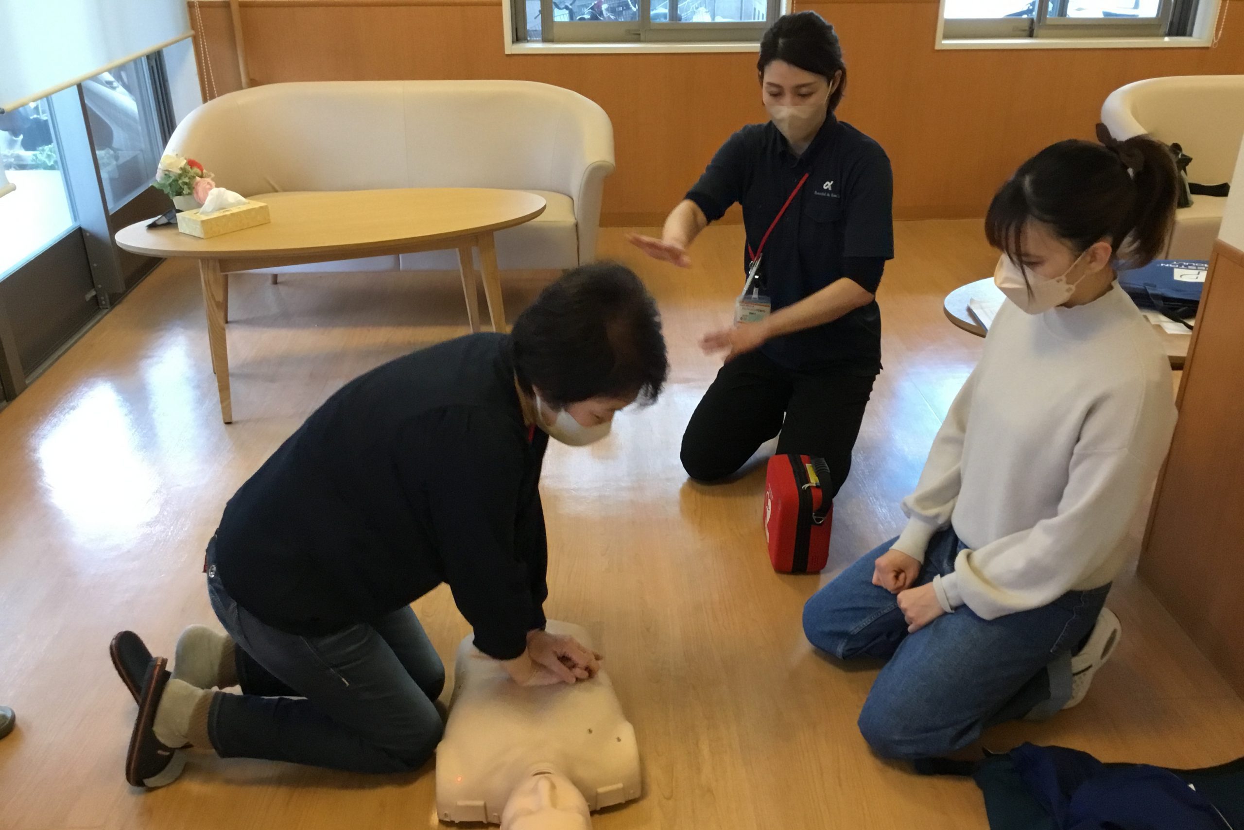 実際にダミー人形を使って、2分間の心臓マッサージをすることは想像よりも過酷で、スタッフは息を切らせ必死に実践していました。
