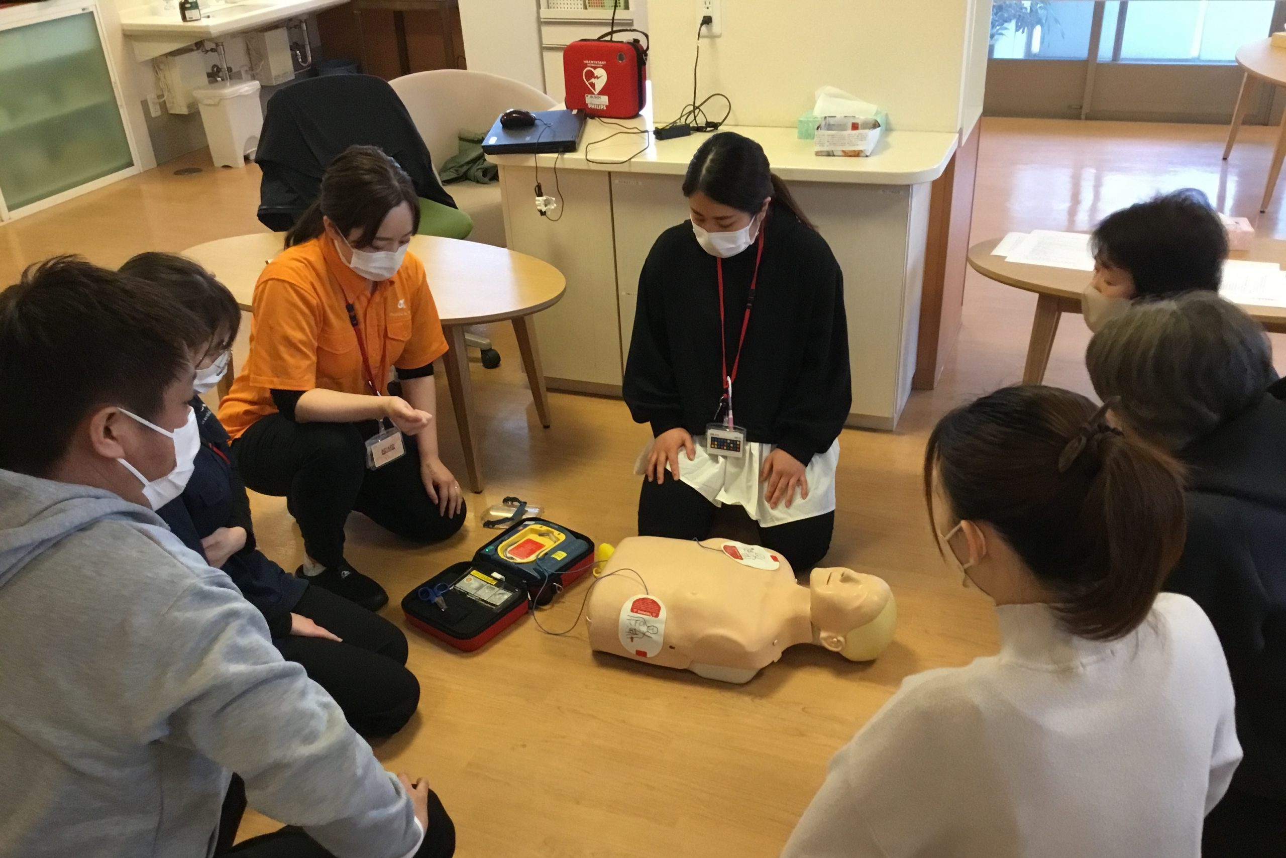 当ホームの看護スタッフが主催となり、AEDの使用方法をメインとした急変時の心肺蘇生法について勉強会を実施致しました。