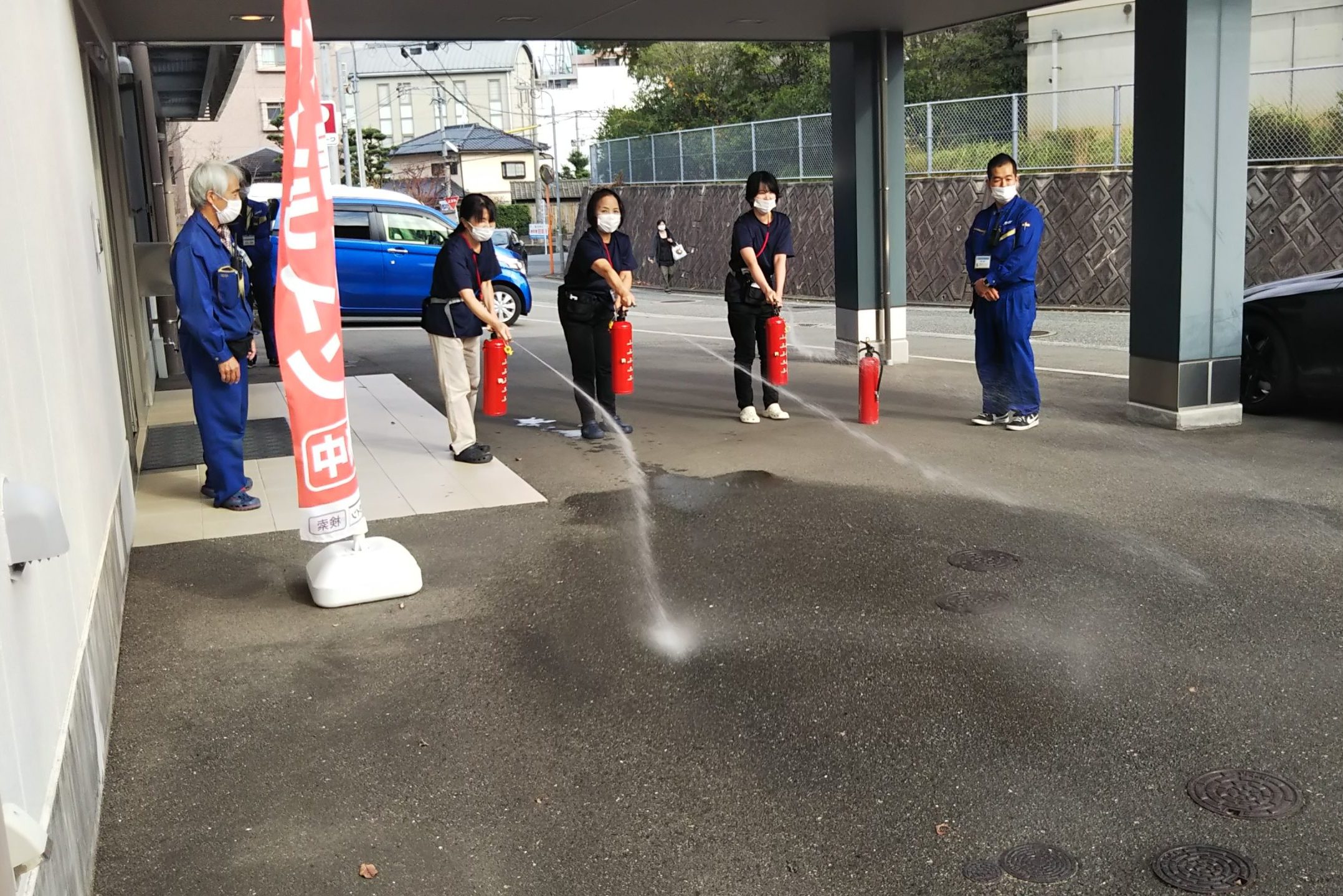 今回の訓練は緊急通報装置の説明、消火用散水栓、消火器を使用した演習の内容で実施しました。