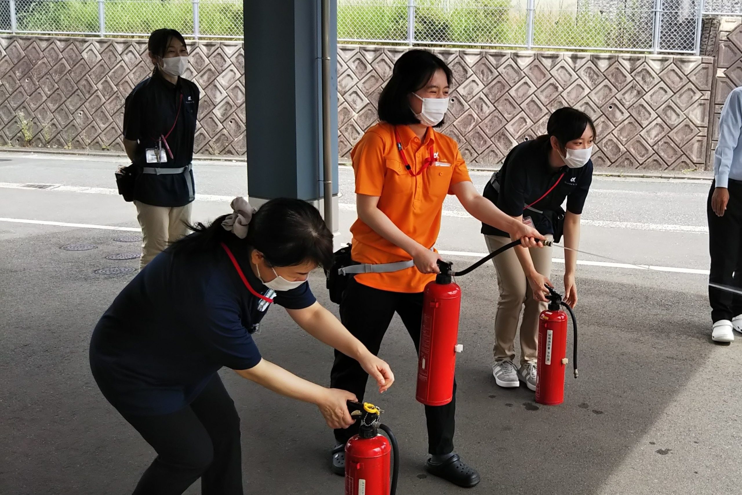 消火訓練では新人スタッフも何度か実施したことはあるようでしたが、消火器使用の手順を確認しながら真剣に取り組んでいました。