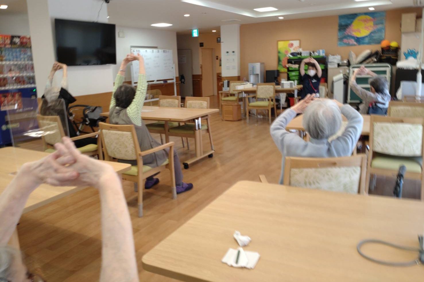 集団での体操では、スタッフの声かけに合わせて無理をしない程度に30分程度の運動を実施。
