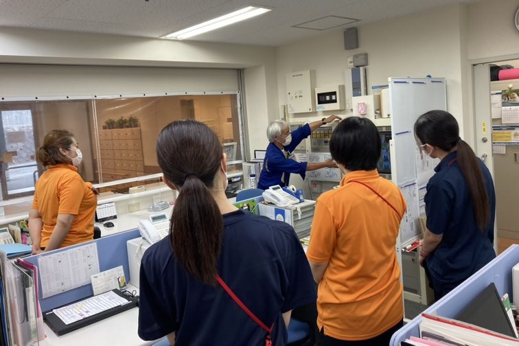 今回の訓練では新人スタッフを中心に火災通報装置・屋内消火栓設備の説明、避難・誘導経路の確認、水消火器を使用した初期消火訓練を行いました。