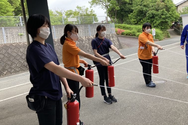 水消火器を使用しての初期消火訓練では、今まで訓練を行ったことがあるスタッフも一緒に訓練を行いました。
