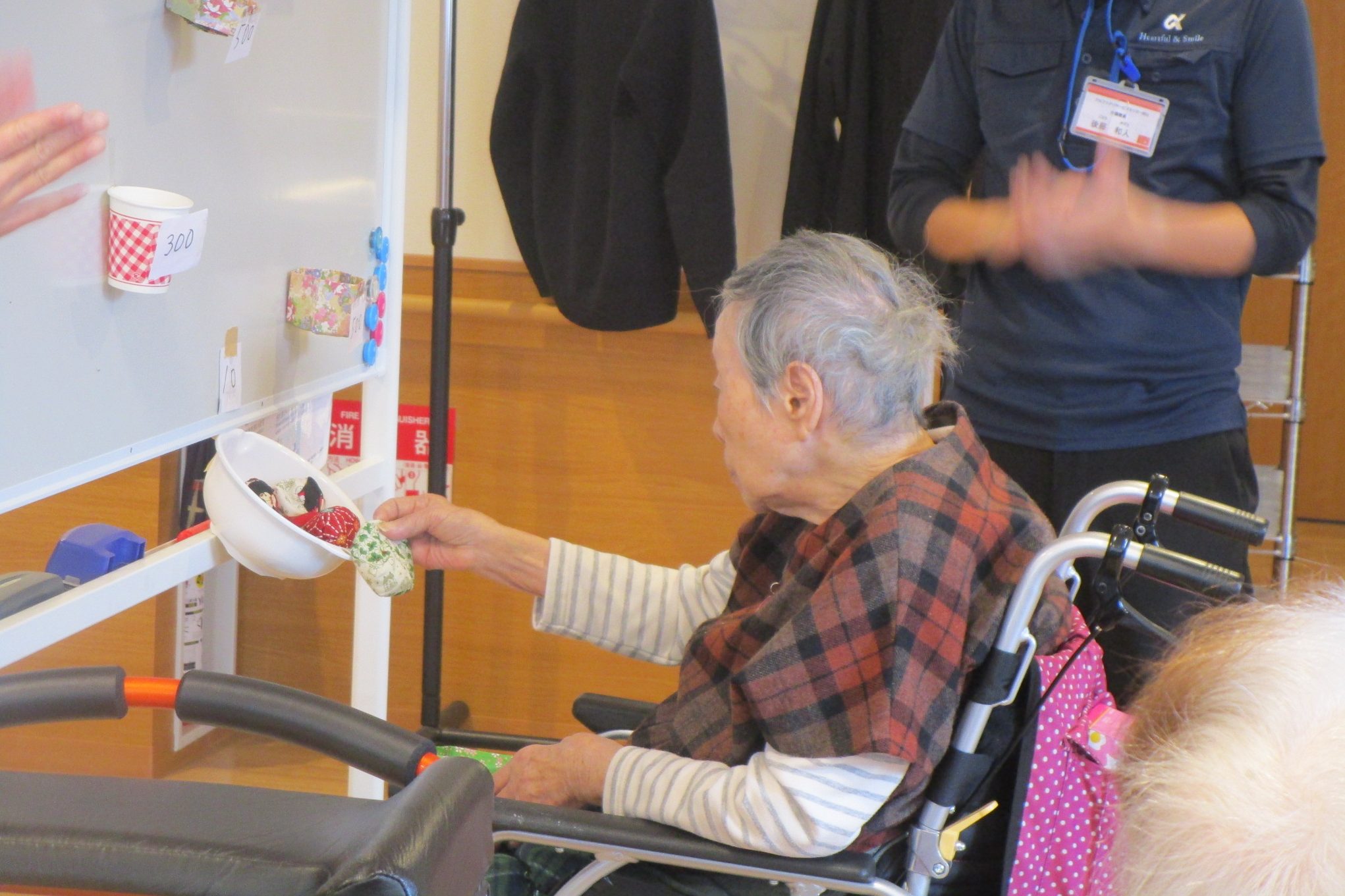 Oさまの番がやってきました。いつもはスタッフがお手伝いさせていただきながらレクリエーションに参加されていますが、この日はご自身でお手玉の入った箱を持たれ、得点の書いたカゴを目指して、入れようとされています。