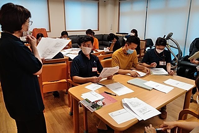 今回は「危険予知訓練・リスクマネジメント」について研修を行いました。講師はデイサービス管理者のおきもとさんです。