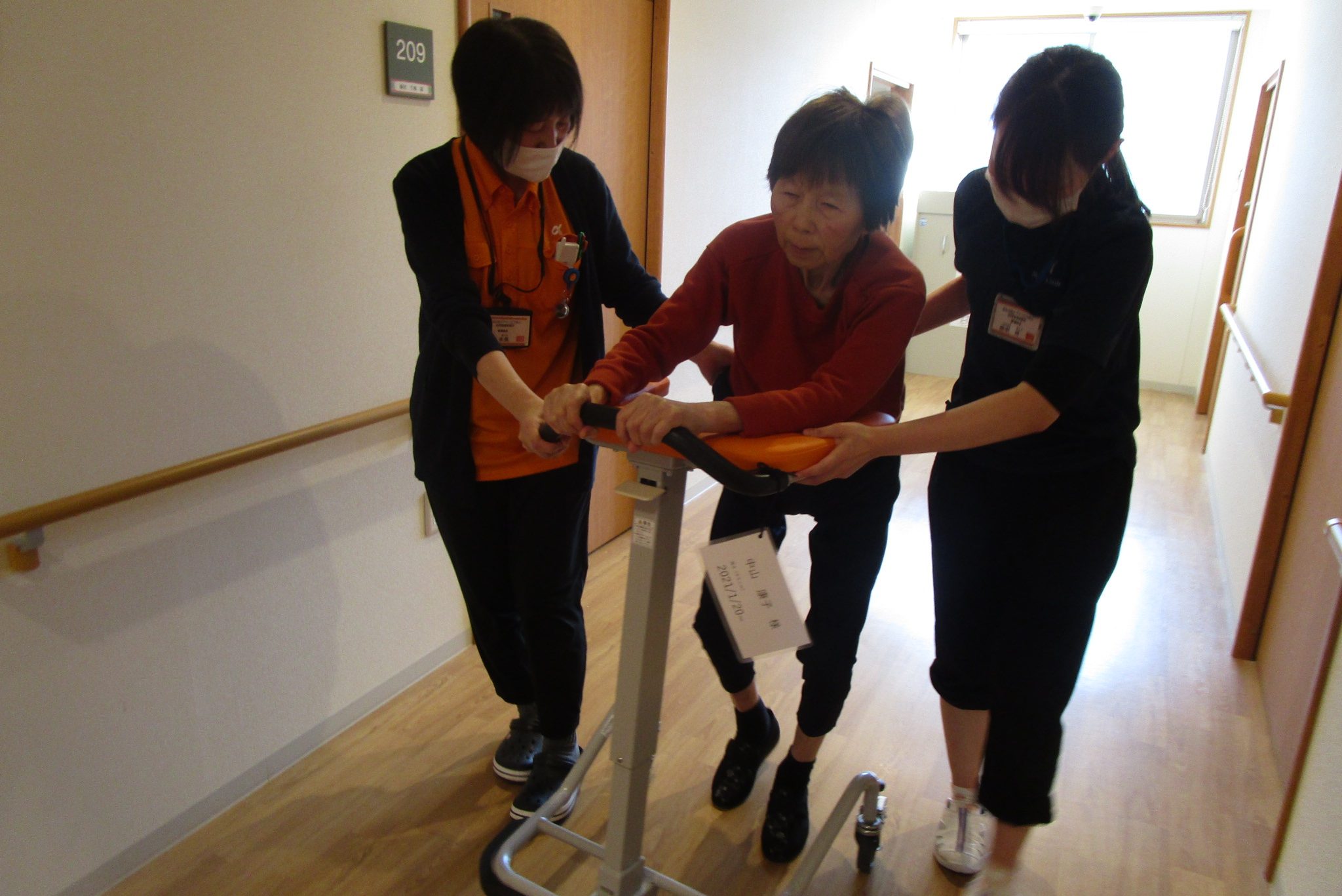 歩行器を導入しましたがNさまは筋力低下も強い為、歩行リハビリを看護スタッフ一人で行うことは難しい状況でした。