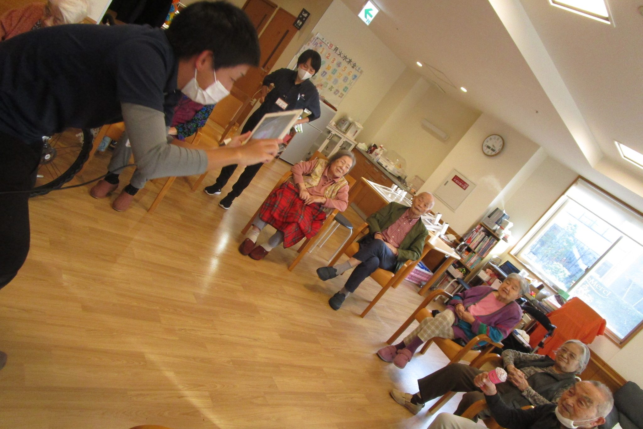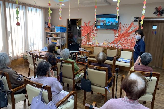一人一人が自己紹介をされ、レクリエーションを始めると皆さん楽しまれ、画面の向こうの方々と一緒に歌を歌ったり、クイズをしたり、大盛り上がりでした。