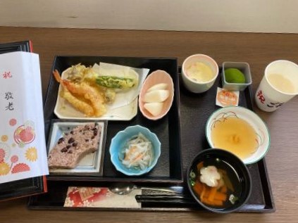 「おいしいもん」は、人それぞれ好みがありますが、スタッフで話し合って、敬老のお膳に和菓子と甘酒を添えて提供させていただきました。