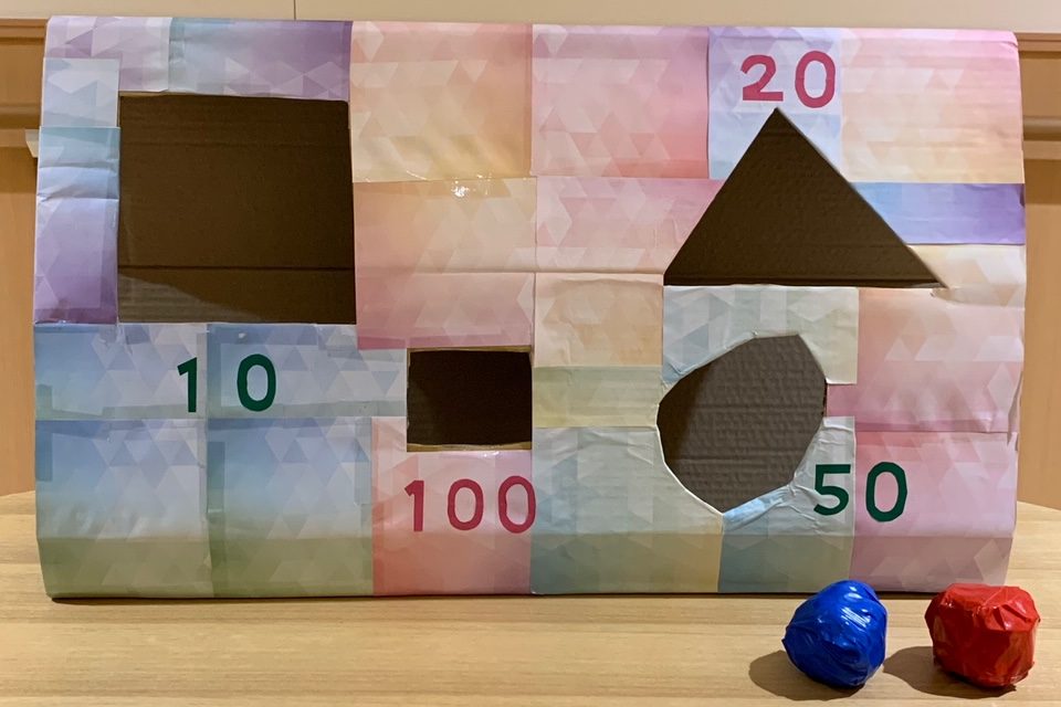 『球入れ』は、10点から100点まで得点が入る大小様々なワクの中に、まぁるいボールを投げ込んで、合計得点を競うゲームです。