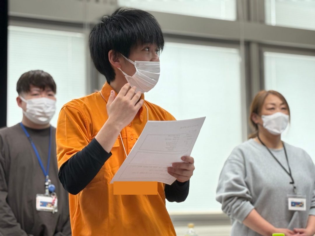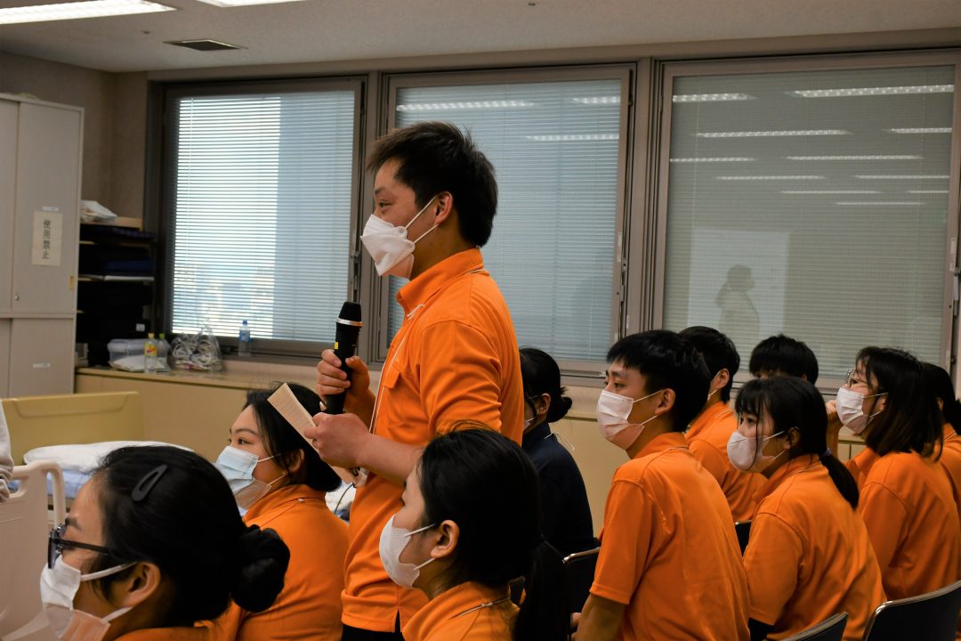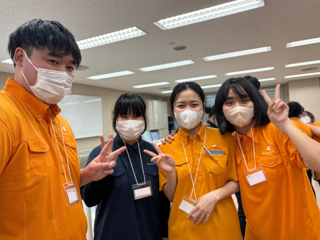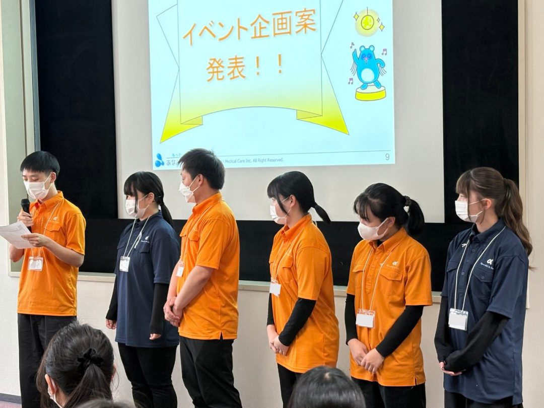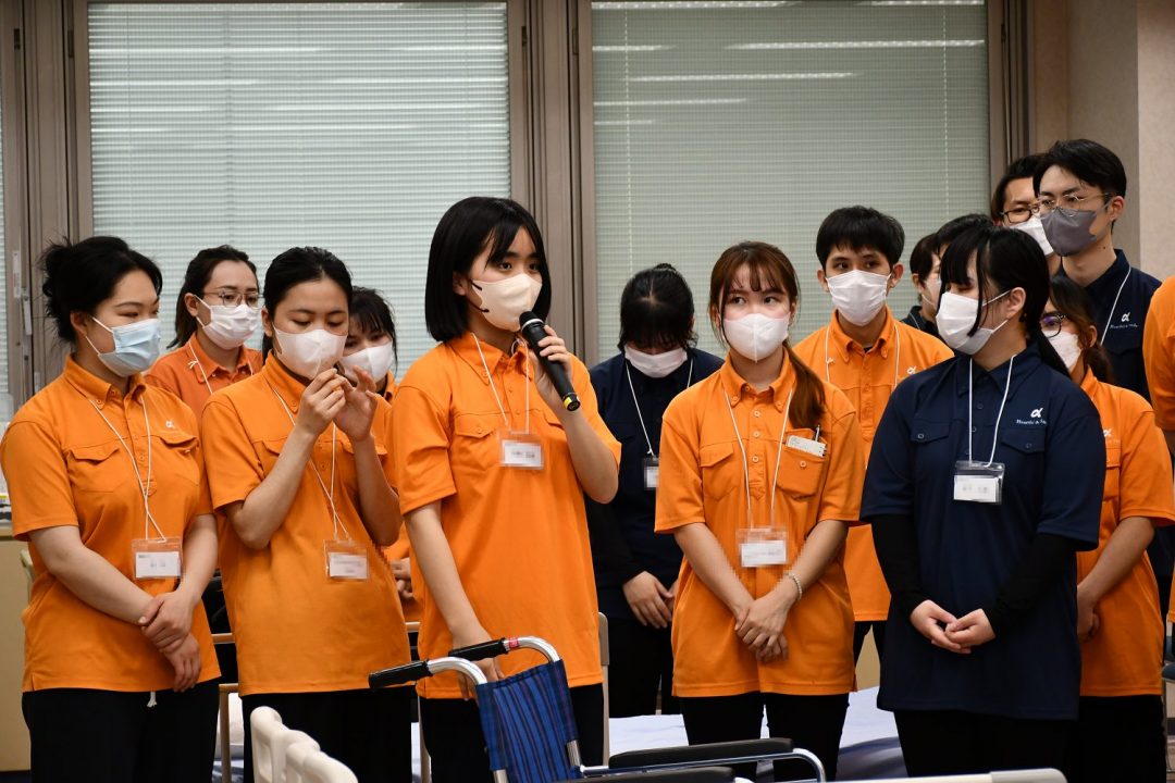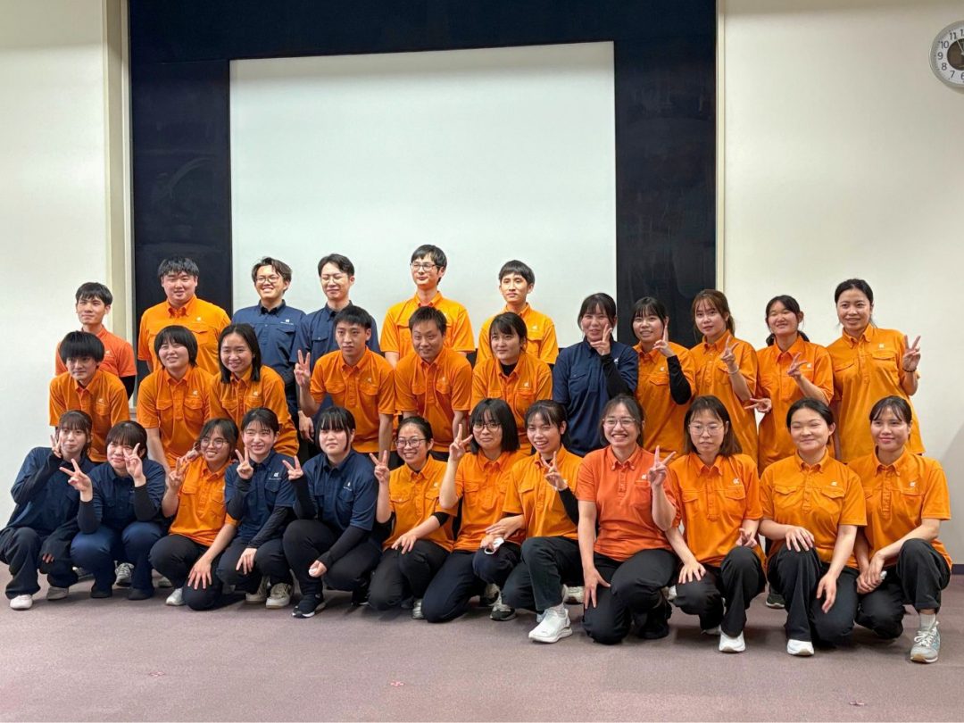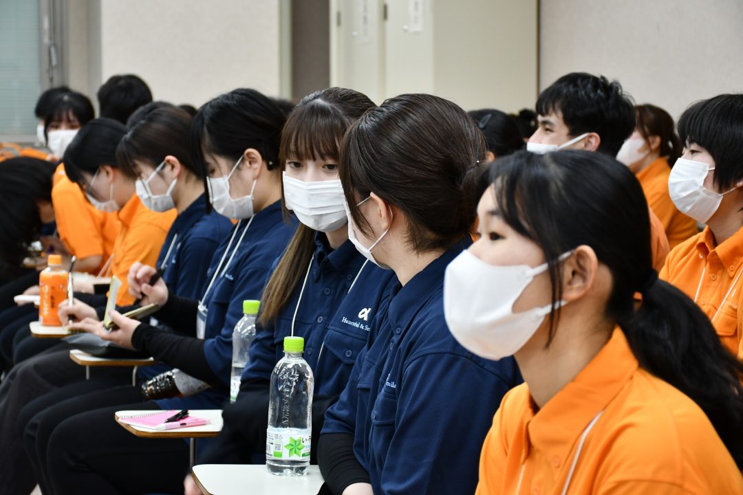 今回の研修は、新入社員の皆さん全員にあなぶきメディカルケアの制服を着用していただきました。鮮やかなオレンジがとても印象的で、全員が並ぶと圧巻の光景でした。