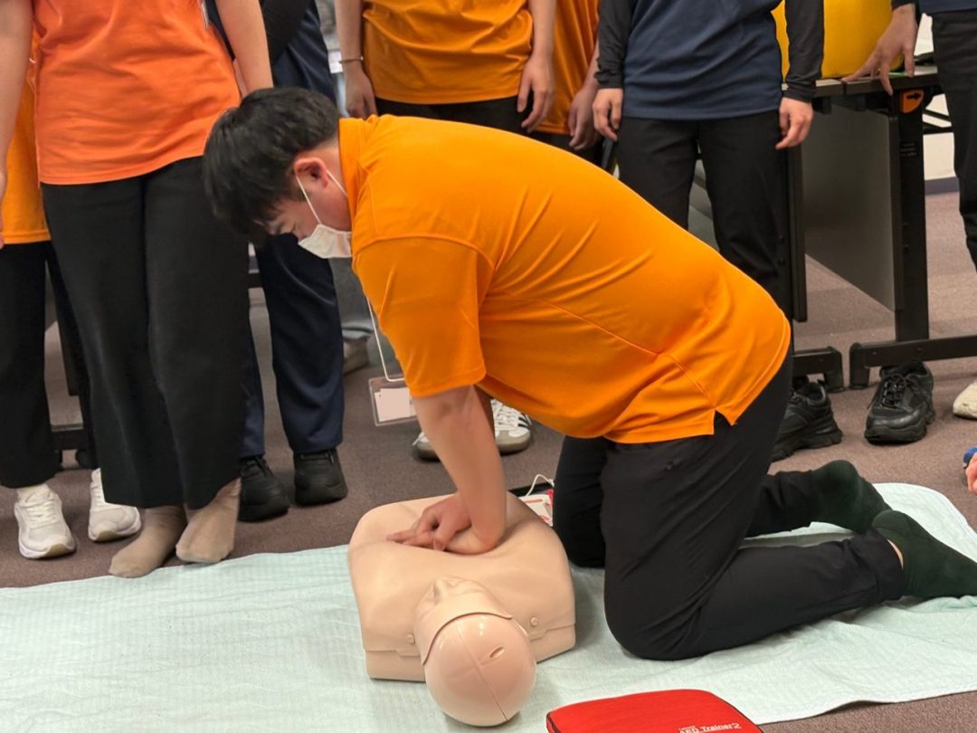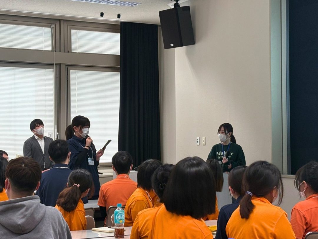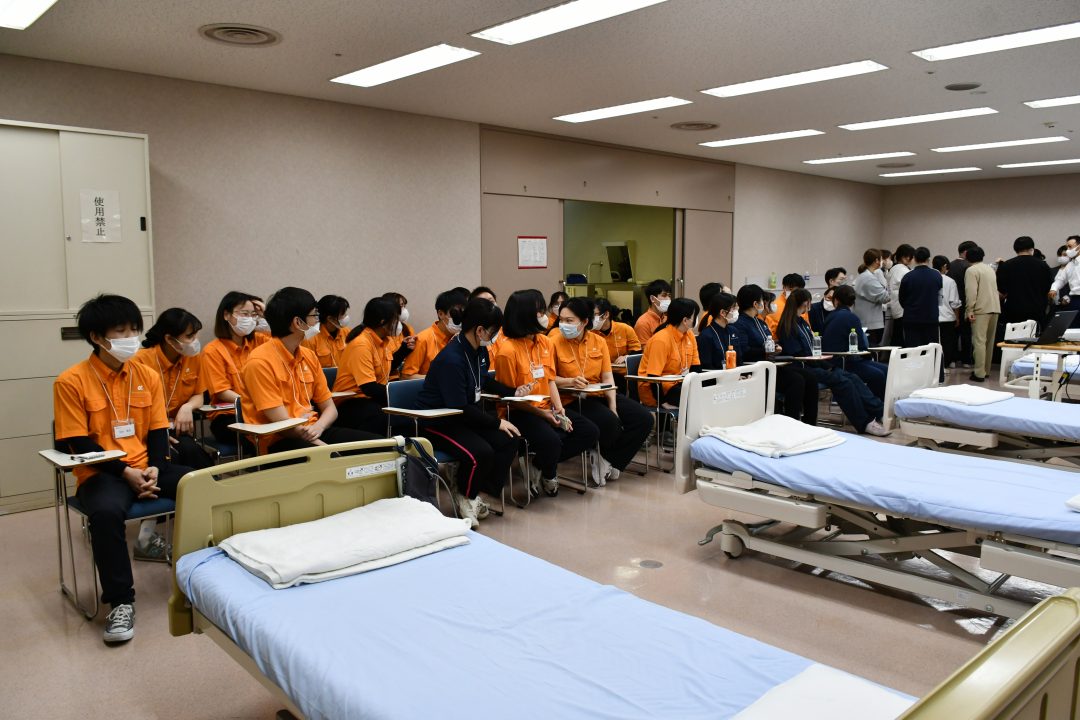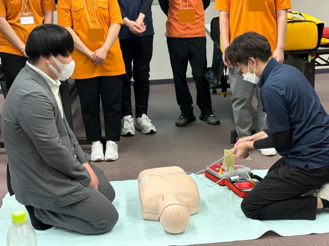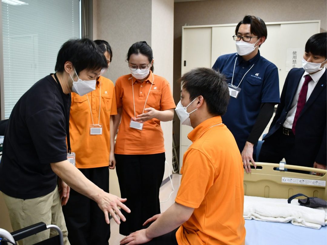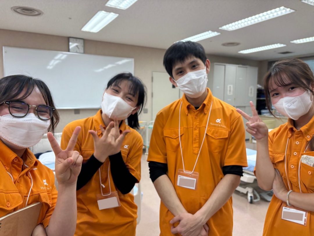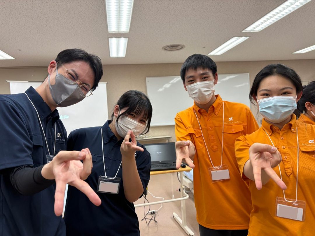 今回の研修は、新入社員の皆さん全員にあなぶきメディカルケアの制服を着用していただきました。鮮やかなオレンジがとても印象的で、全員が並ぶと圧巻の光景でした。
