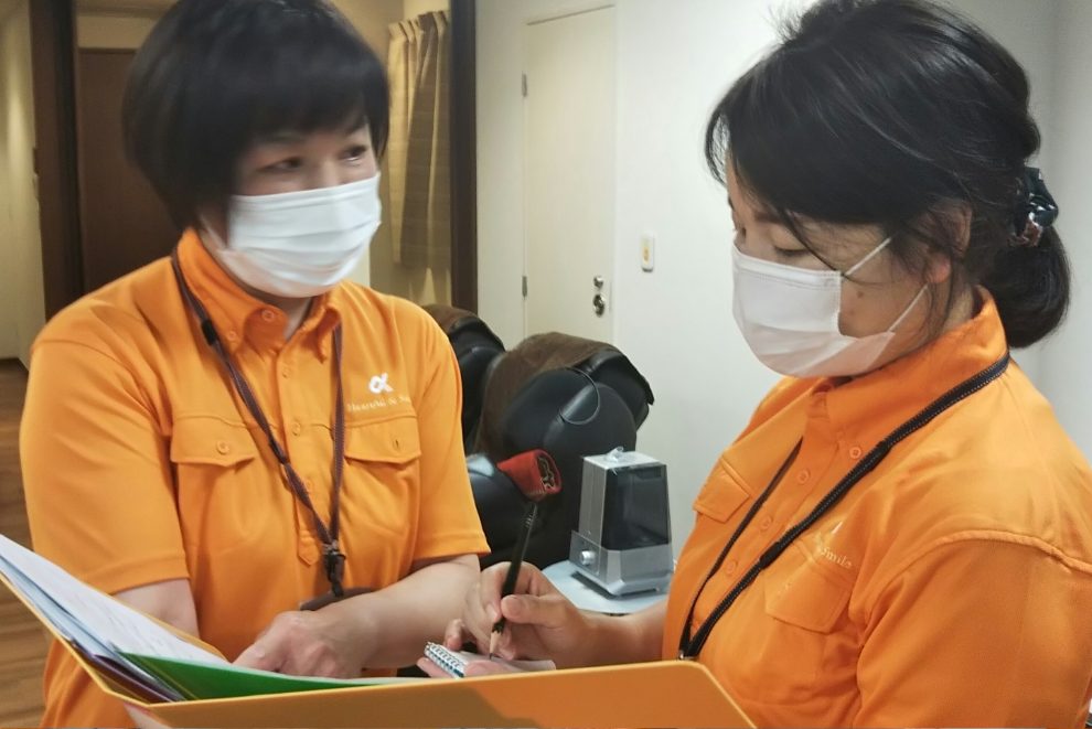 サービス提供責任者のかまださんとご入居者の生活動作の確認をしたり、