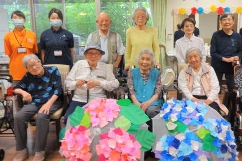 そんな中少しでも季節を感じていただこうと、介護スタッフのこうのさんの発案で色とりどりの紫陽花を咲かせました。