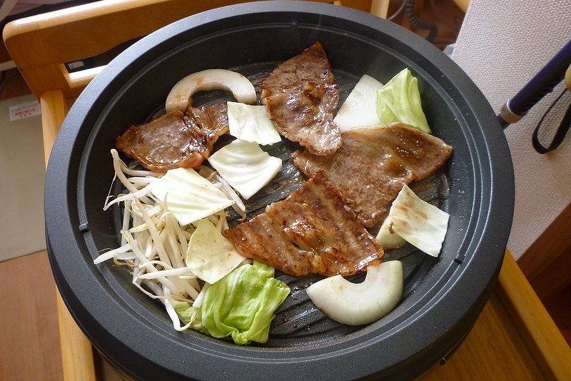 そこでご家族とスタッフ全員で話し合いを行い、居室でホットプレートを使った焼き肉を食事介助としてサービスへ導入しました。