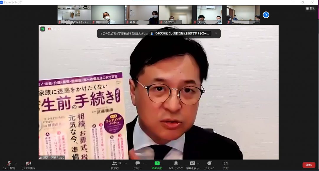 各地域のエリアマネージャーと施設長、管理者などが、2023年8月18日、一般社団法人 終活カウンセラー協会様主催の「終活セミナー」をオンラインで受講しました。