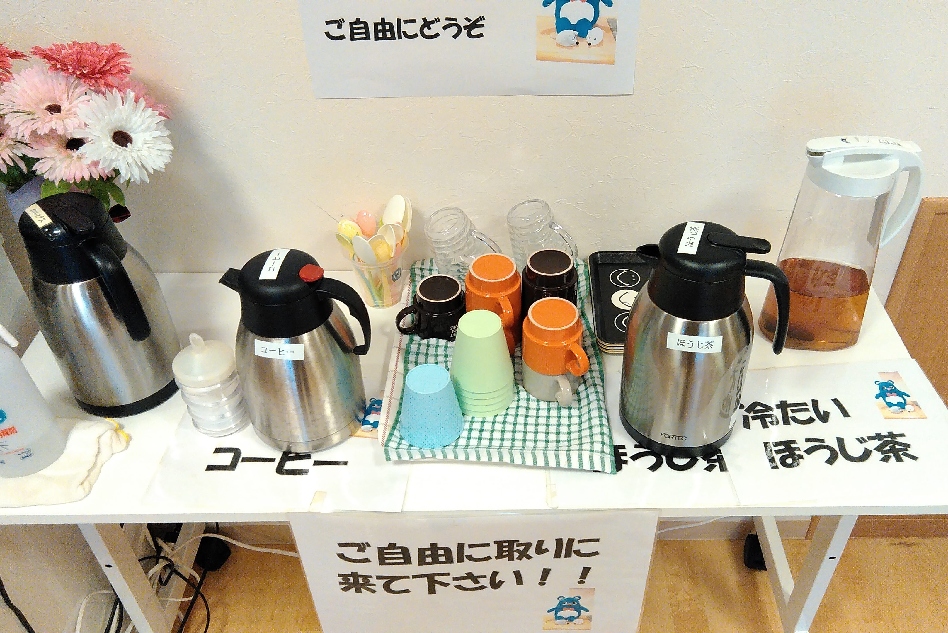 初めは、コーヒー(温)とほうじ茶(冷・温)、梅昆布茶の3種類でスタートしましたが、ご入居者の希望により、現在は梅昆布茶をカルピスに変更しています。