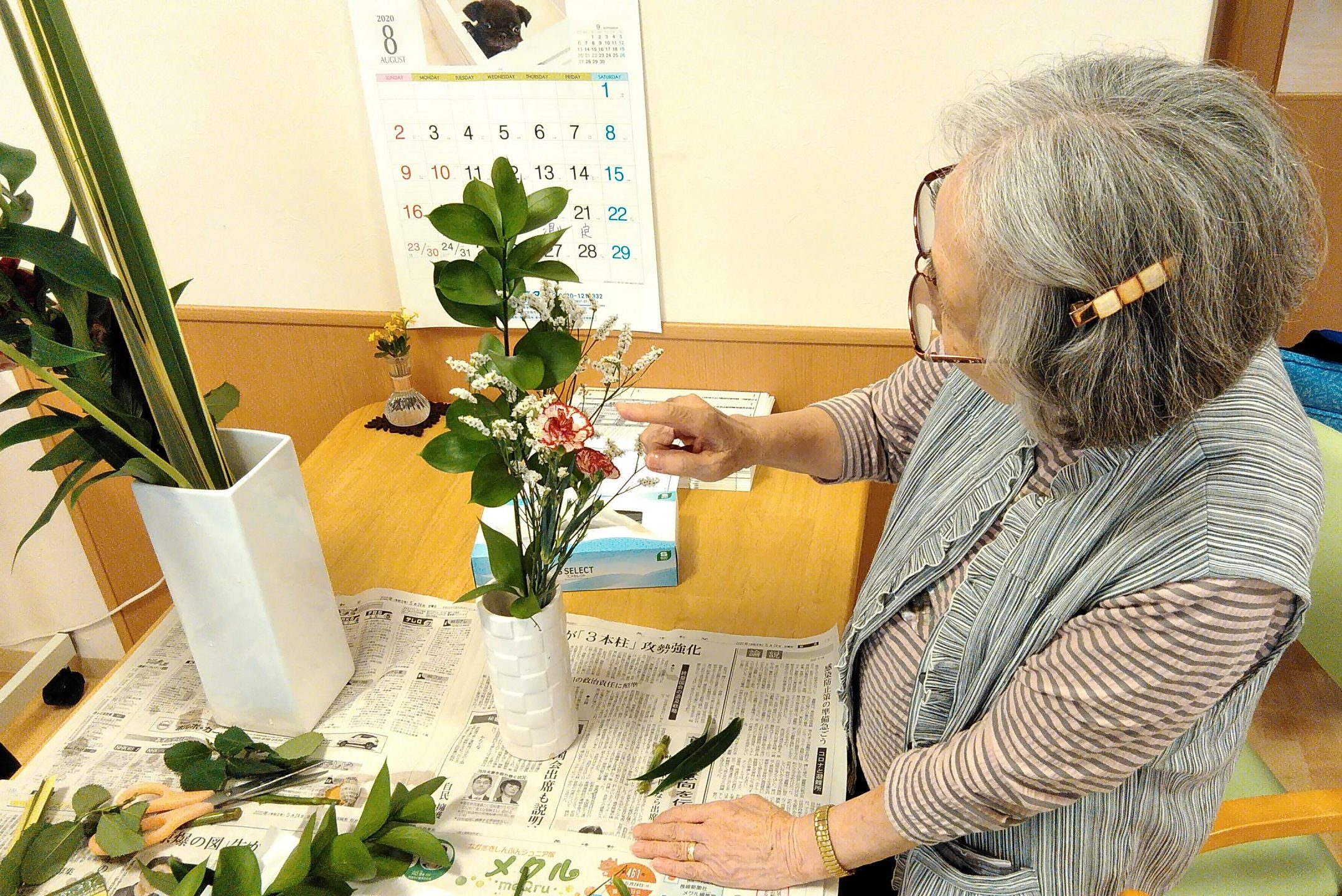 これまでは毎月、介護スタッフがホームの玄関の花を生けていましたが、ご入居者のご要望によりお願いすることにしました。