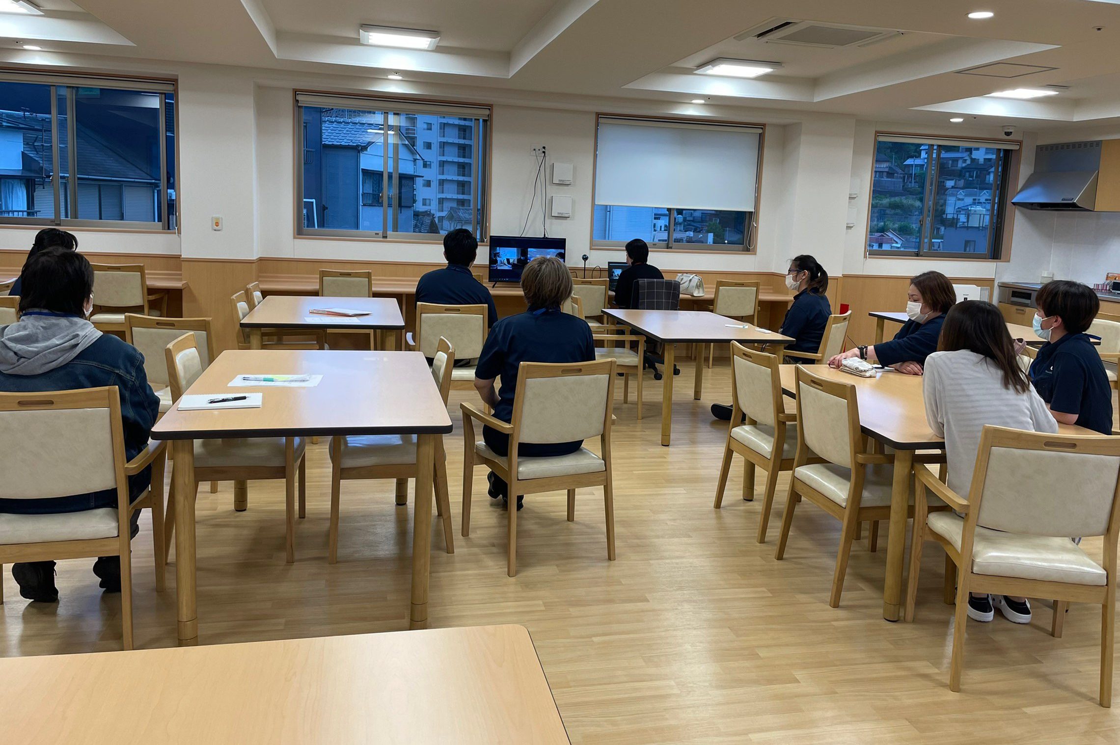 アルファリビング長崎諏訪の杜では、毎月月末に全体会議と研修会を行っていますが、今回はアルファリビング長崎大浦と合同の研修会を開催しました。