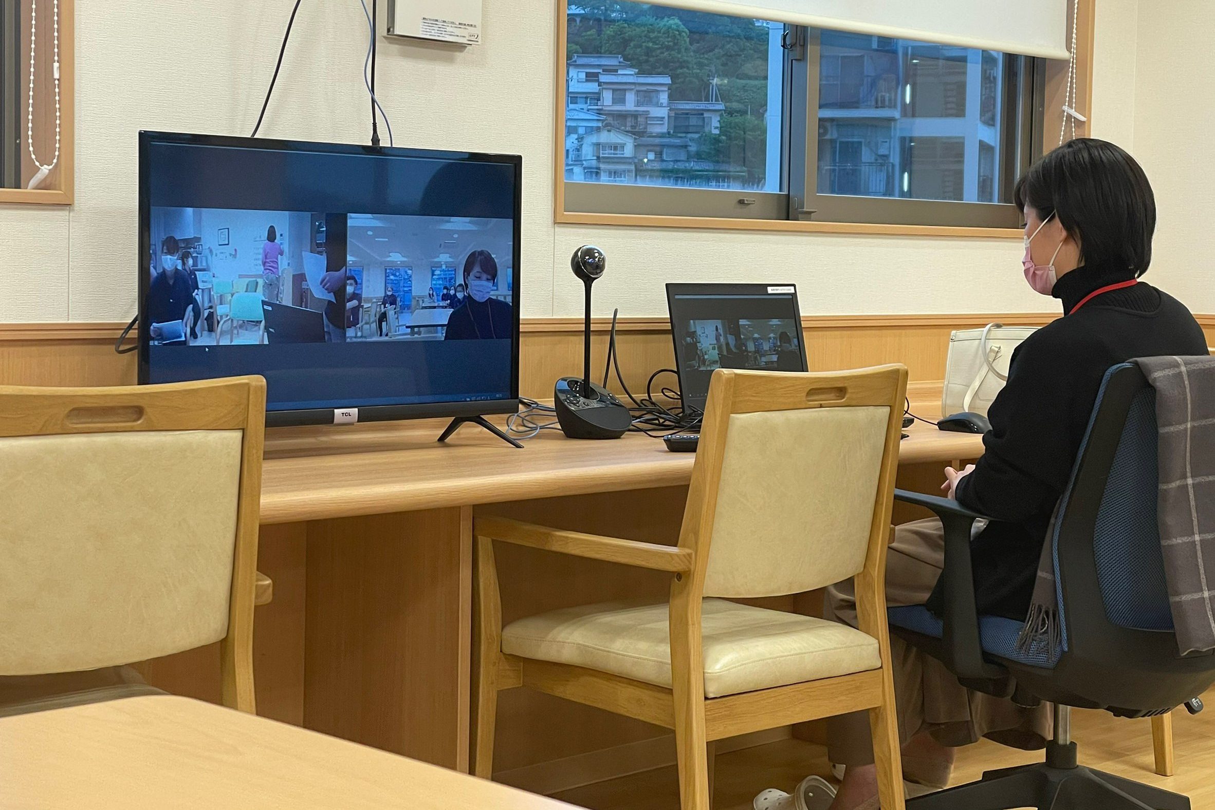 感染症対策で、長崎諏訪の杜と長崎大浦をオンラインで繋ぎ、自拠点から参加しました。