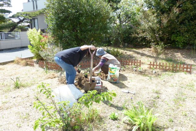 ご入居者が草むしりをしてくださり、スタッフも一緒に野菜の苗を植えました。