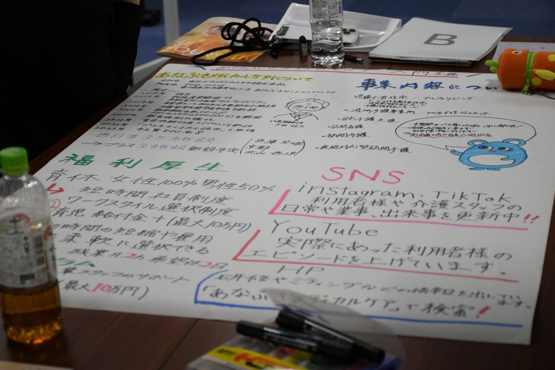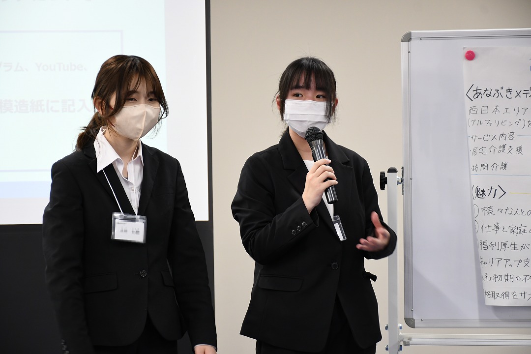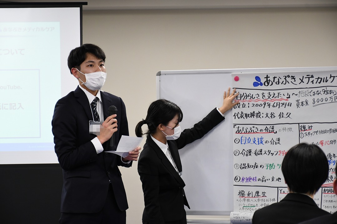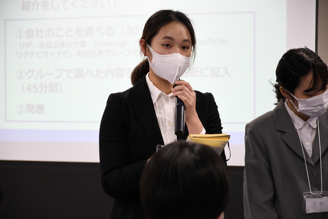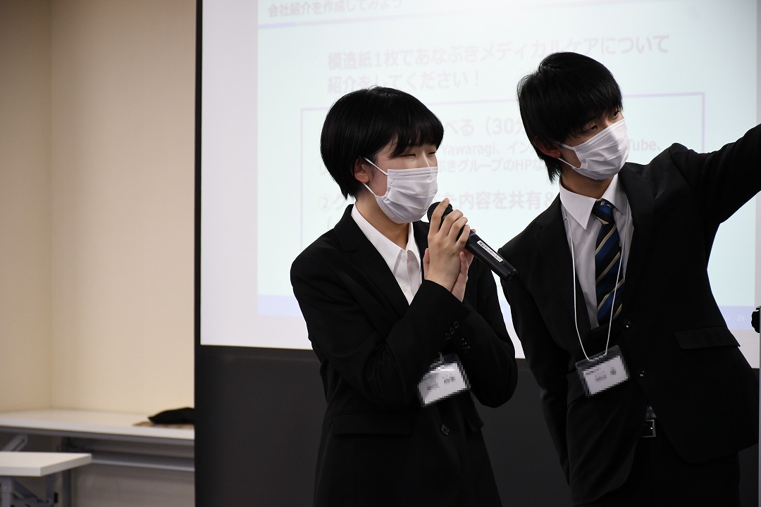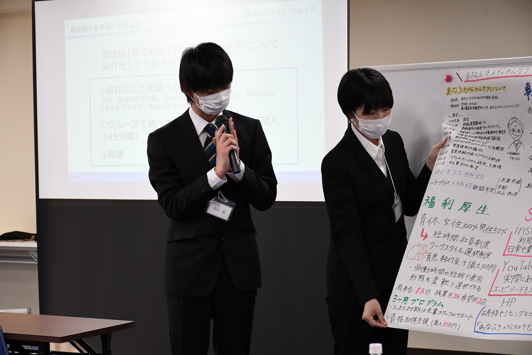 今回の研修のメインテーマは「あなぶきメディカルケア」について調べ、班ごとに発表することです。インターネット、ホームページ、リクルートサイト、Web社内報Yawaragi、インスタグラム、パンフレットなどを情報源に、当社について詳しく調べました。